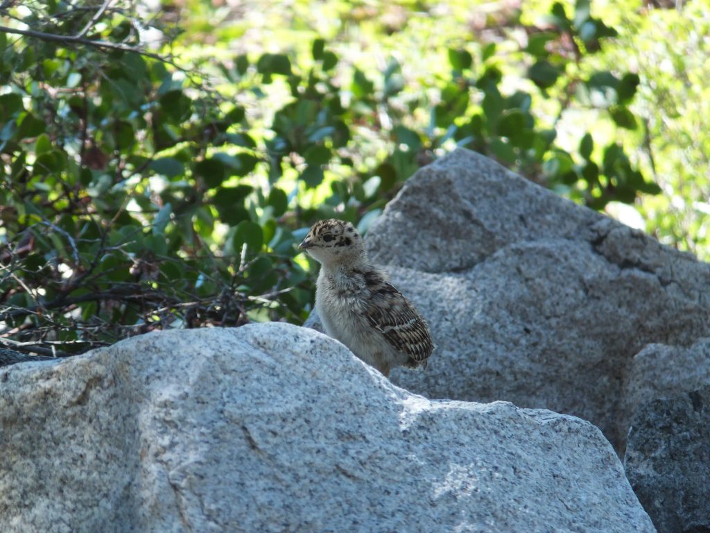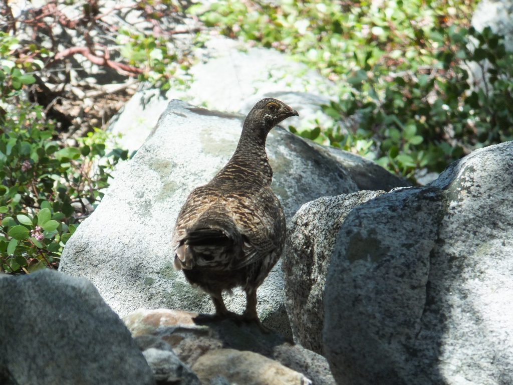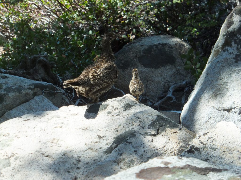 Nu börjar rejäl stigning. Magnifik utsikt bakåt mot spetsiga, branta berg. Leden slingrar sig vid sidan av vattenfall/strid fors. Nära trädgränsen ser vi en Grouse med flera ungar.
