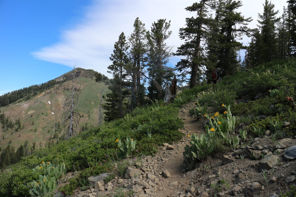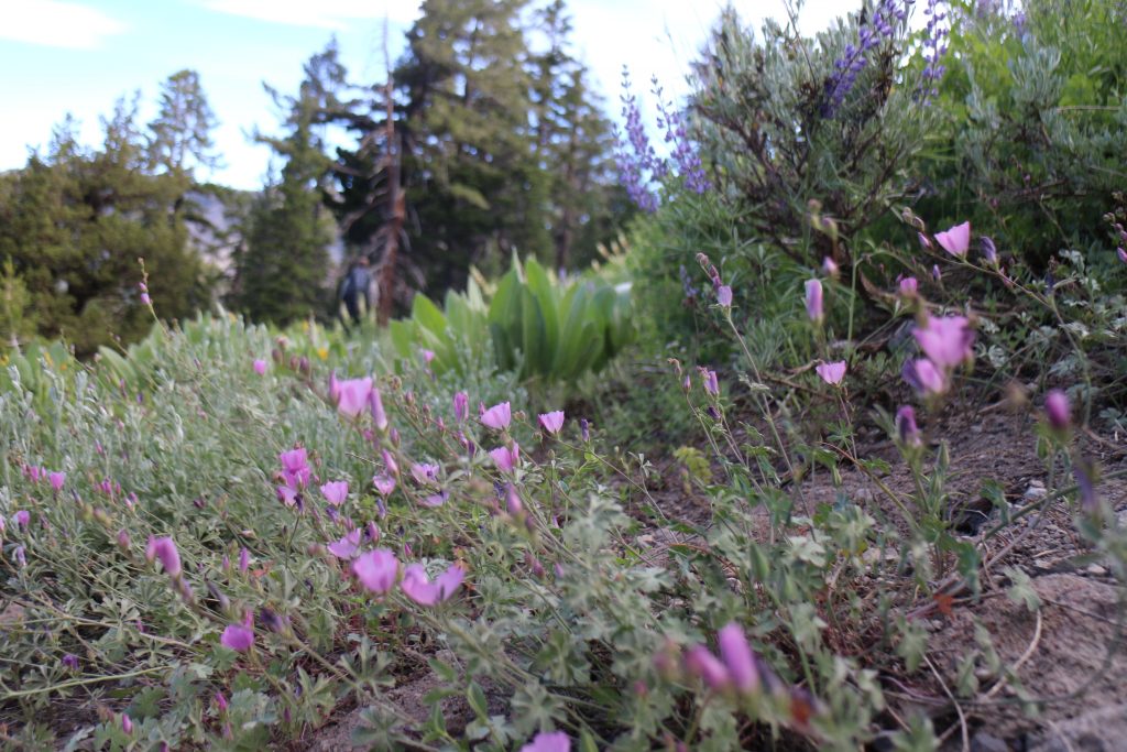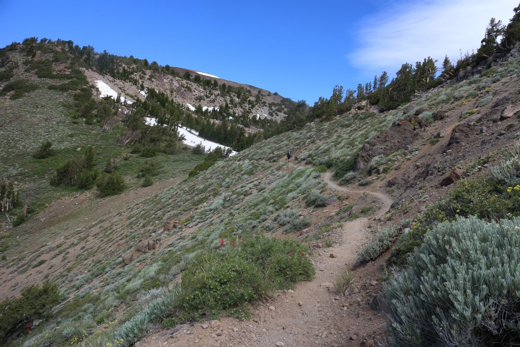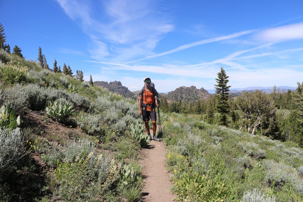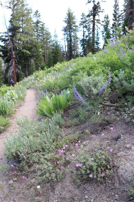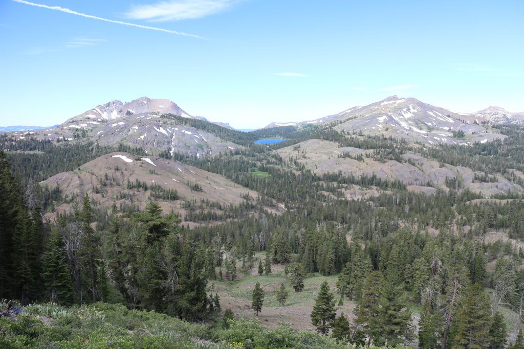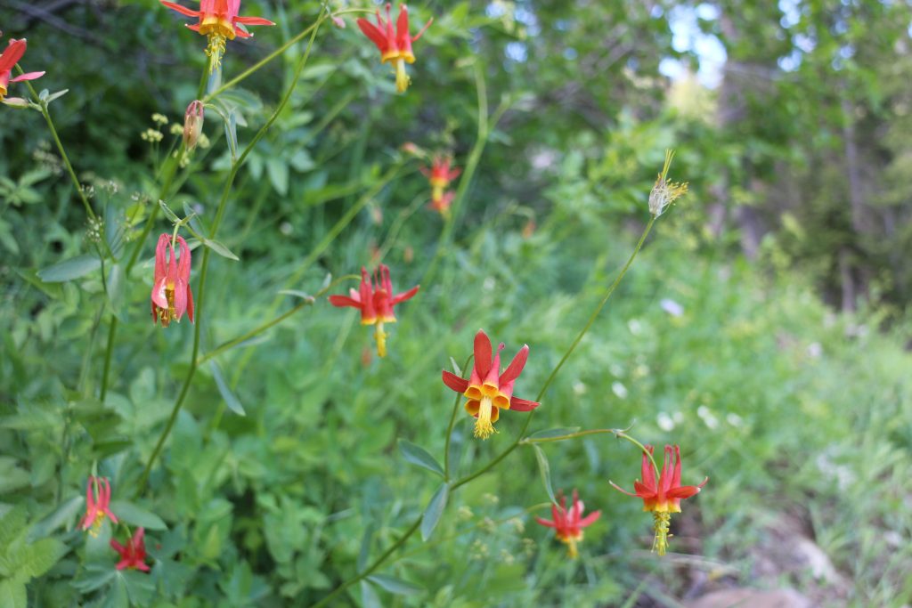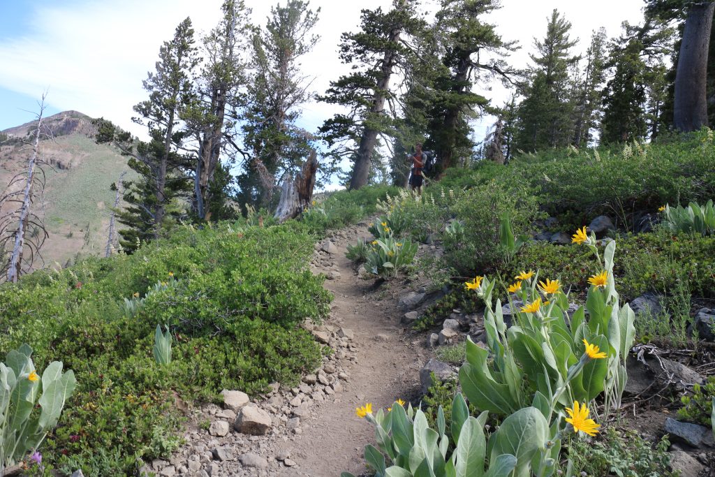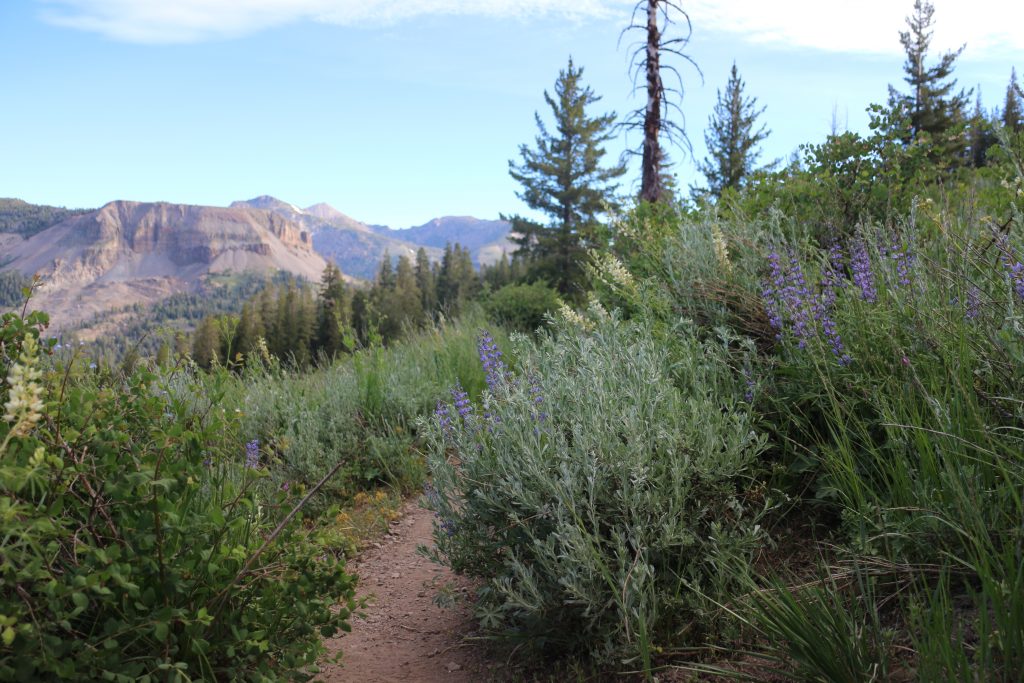 Gran och tall, fåglar, blommor i olika färger, ängsmarker, öppna små gläntor, en och annan sjö, mindre snöpartier, partier med storskog med brun, torr, kådadoftande barrmatta under kronorna. Rätt så kuperat och varierat, precis som igår. Vacker växlande natur. Kullar, berg, vilda western klippor.