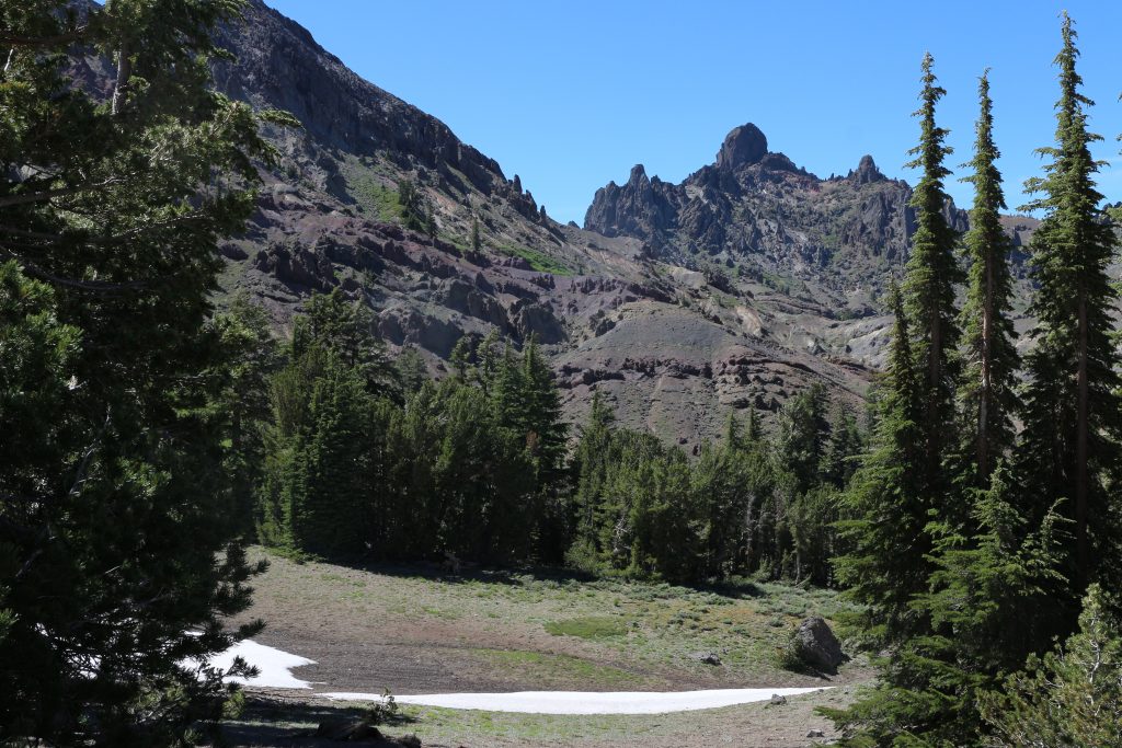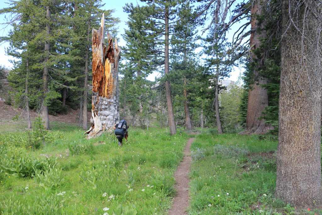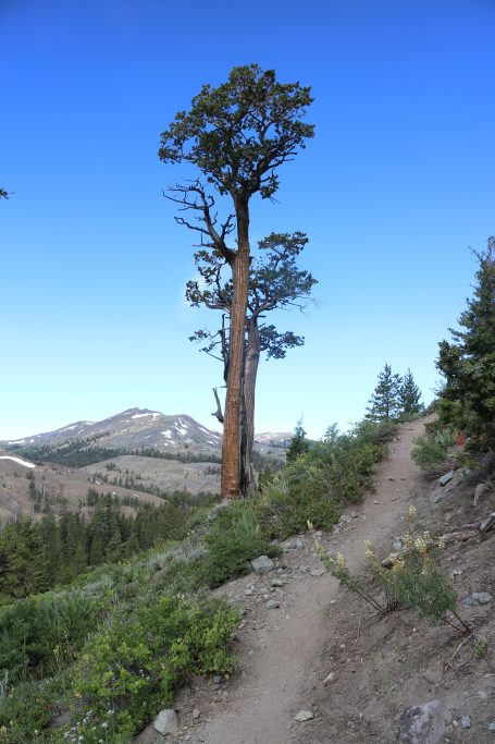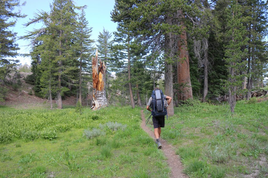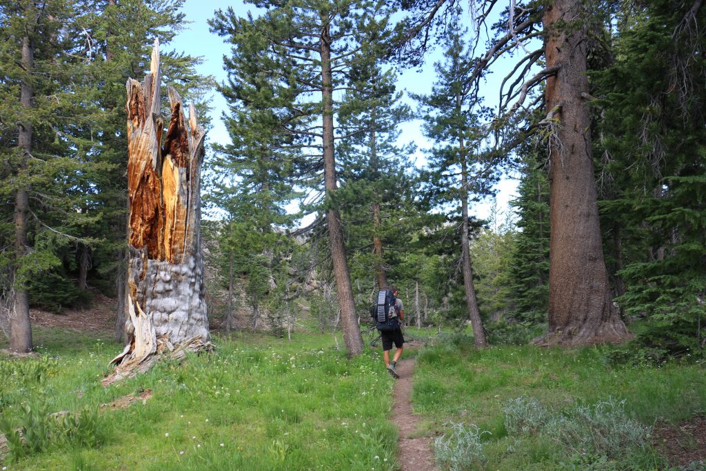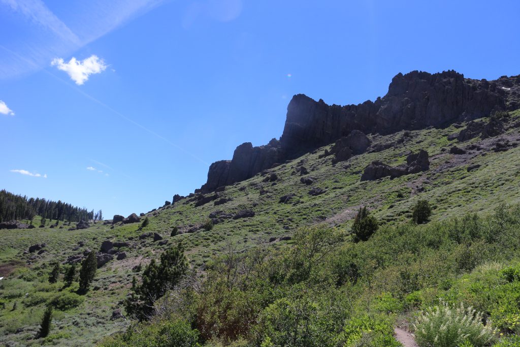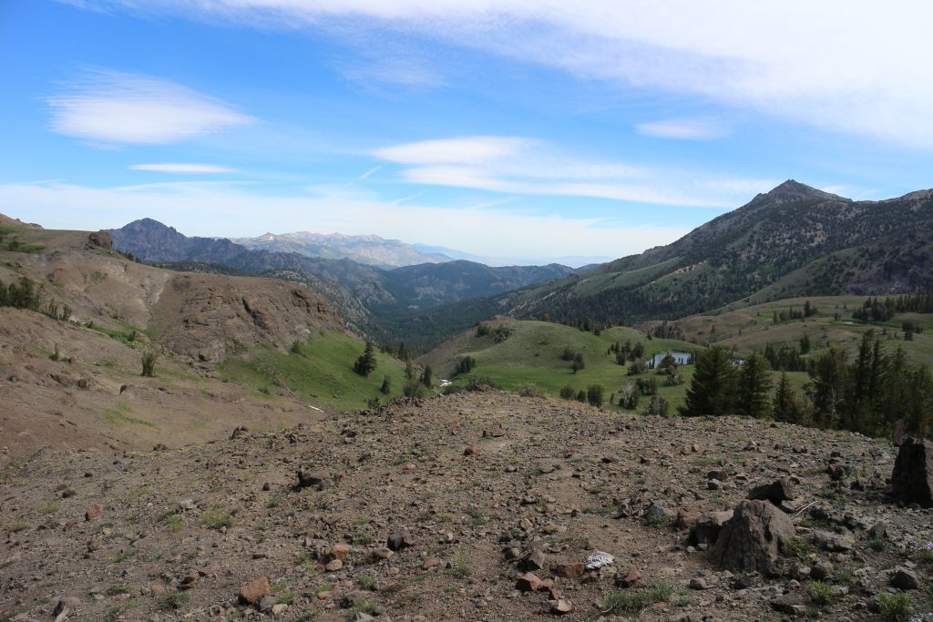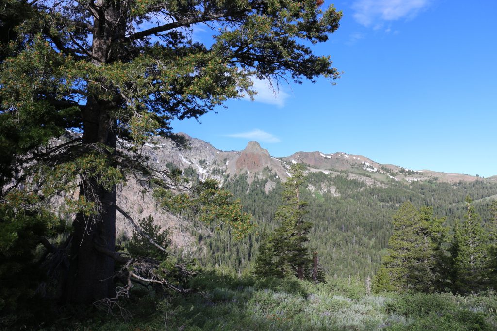Gran och tall, fåglar, blommor i olika färger, ängsmarker, öppna små gläntor, en och annan sjö, mindre snöpartier, partier med storskog med brun, torr, kådadoftande barrmatta under kronorna. Rätt så kuperat och varierat, precis som igår. Vacker växlande natur. Kullar, berg, vilda western klippor.