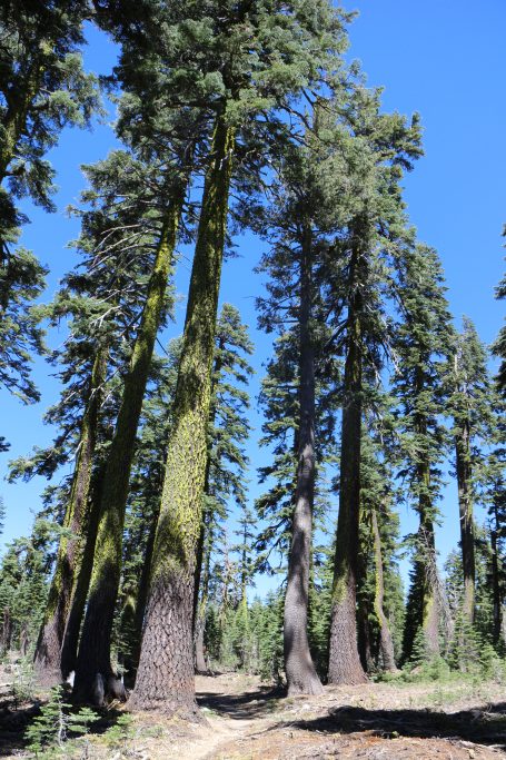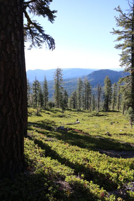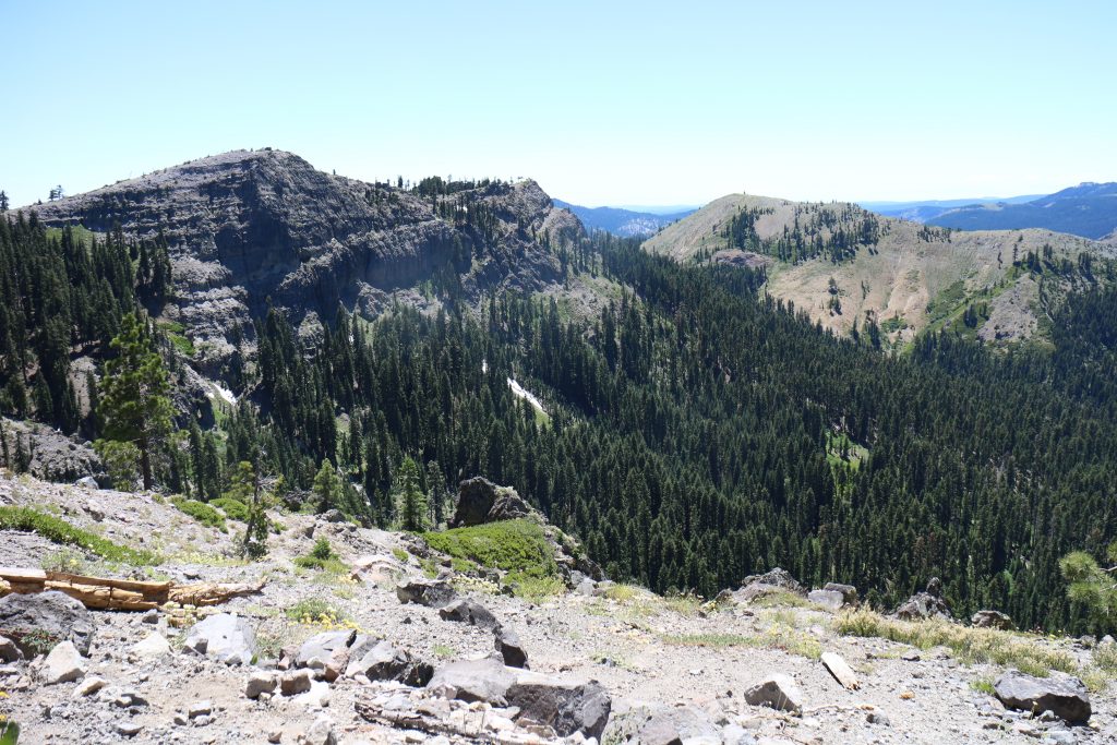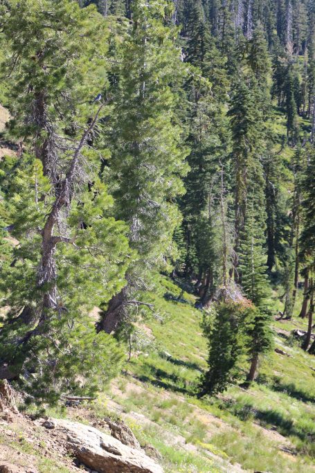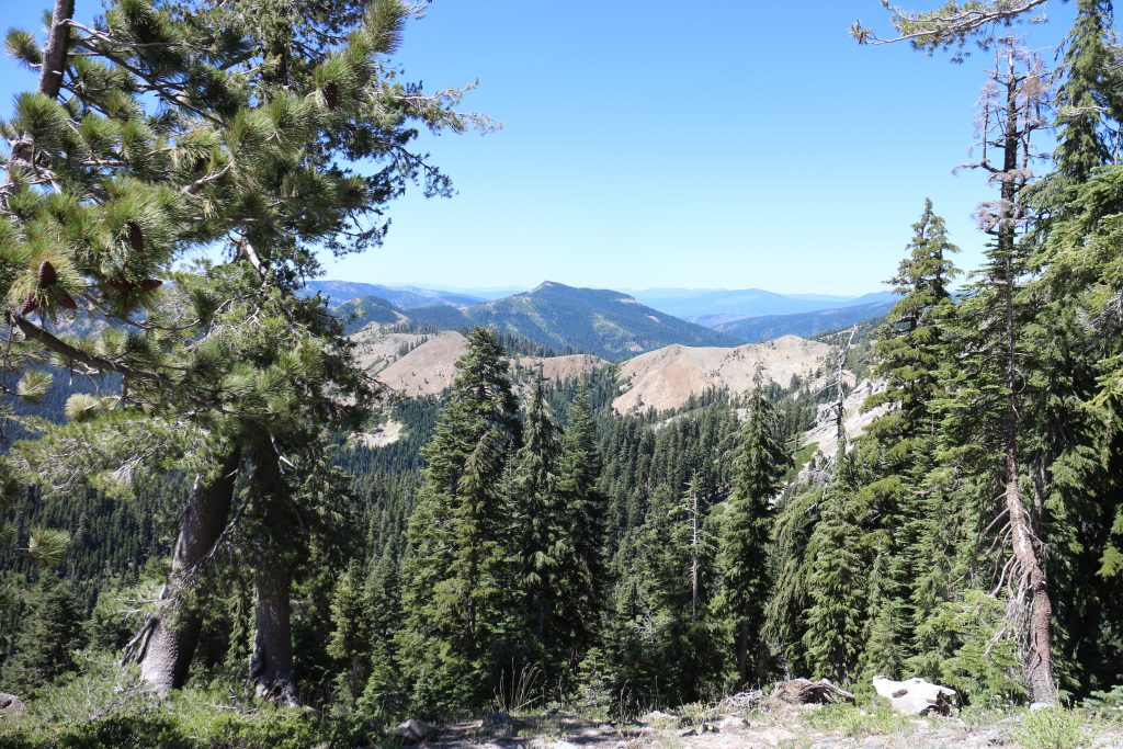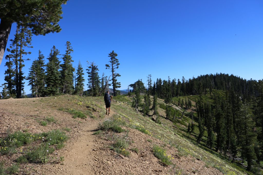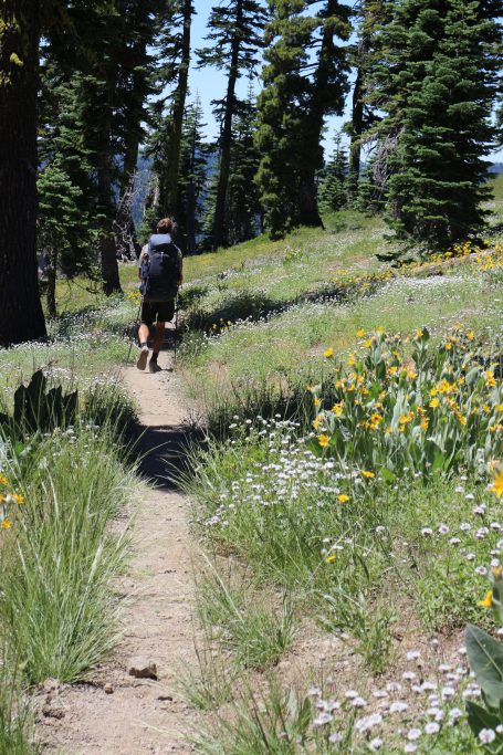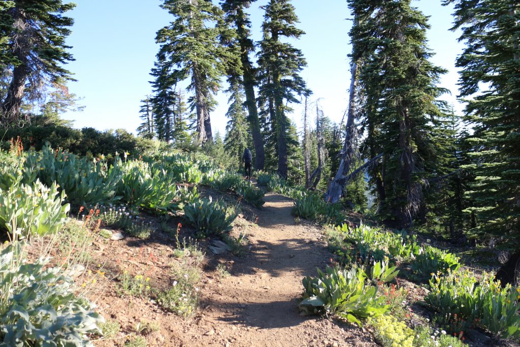 PCT står fortsatt i blom. Röda, orangea, gula, vita, blåa, lila blommor smyckar sidan av stigen när inte skogen står för tät och mörk. Större delen av dagen har vi gått genom barrskog, uppför kullar och nedför densamma. Vi har även gått över en del öppna passager som bjuder på mer utsikt. Flera sjöar har vi sett, men ingen som vi passerat. Dom vattendrag vi korsar har blivit både färre och mindre. Ett steg så är man över vattnet, fötterna saknar svalkan från tidigare vad.