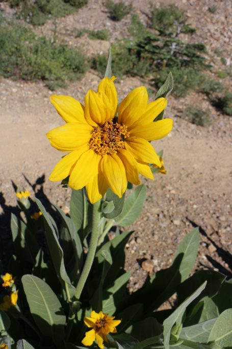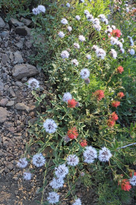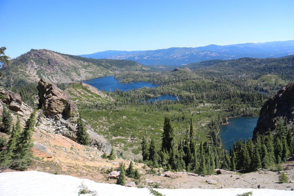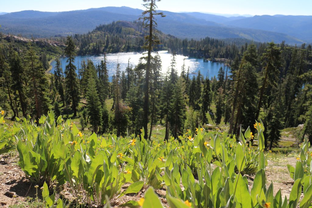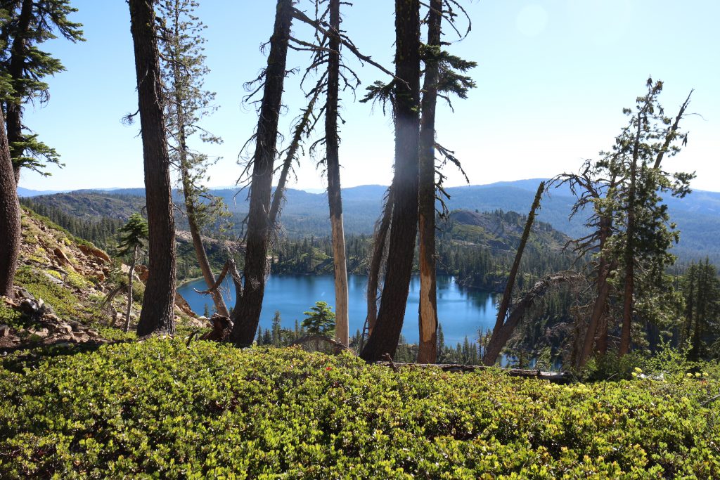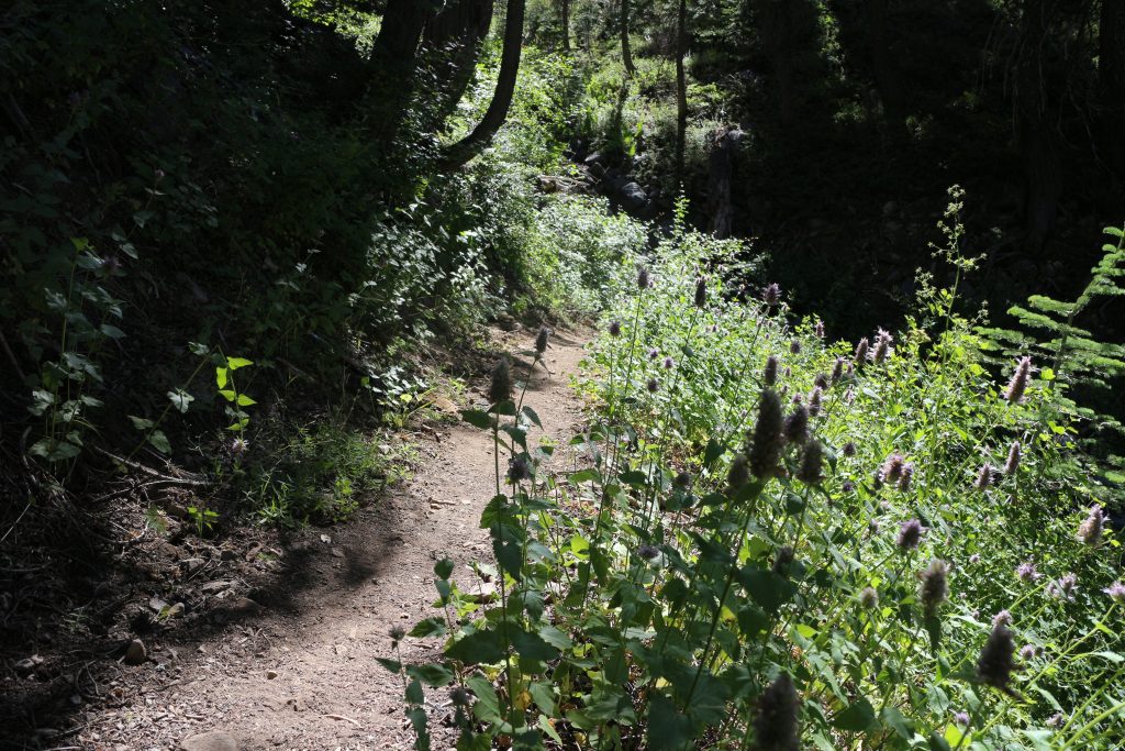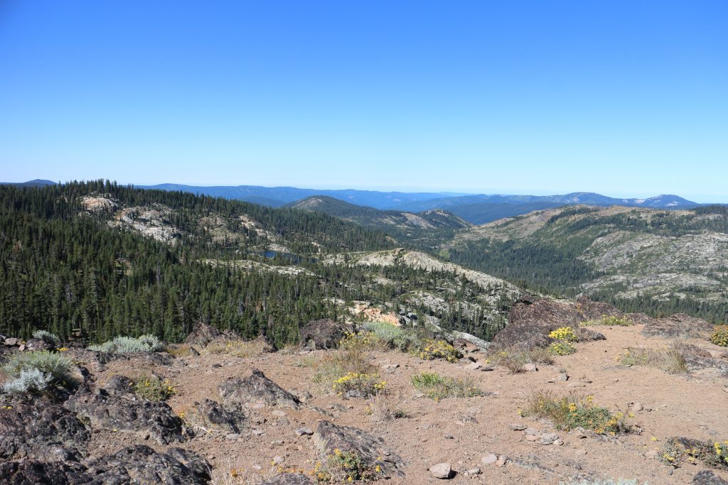PCT står fortsatt i blom. Röda, orangea, gula, vita, blåa, lila blommor smyckar sidan av stigen när inte skogen står för tät och mörk. Större delen av dagen har vi gått genom barrskog, uppför kullar och nedför densamma. Vi har även gått över en del öppna passager som bjuder på mer utsikt. Flera sjöar har vi sett, men ingen som vi passerat. Dom vattendrag vi korsar har blivit både färre och mindre. Ett steg så är man över vattnet, fötterna saknar svalkan från tidigare vad.