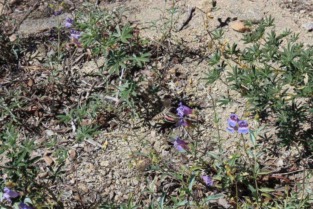 Det är sällan markvegetation i skogarna och det gör att landskapet känns dött även fast det är i allra högsta grad levande. Stigen vi följt är torr och dammar mycket vilket färgar ben och fötter smutsbruna. I lövskogen är det mer färg, många nyanser av grönt. Gått över några vackra blomsterängar, på en av dom såg jag en fin, kolibristor svärmare som drack nektar från några blå blommor.