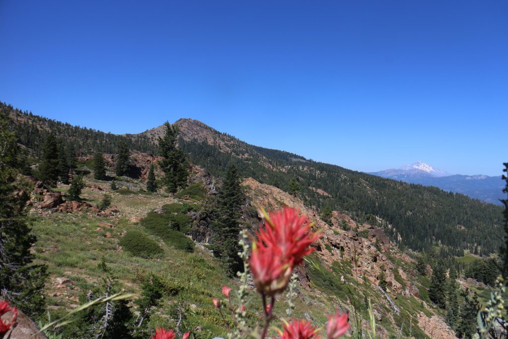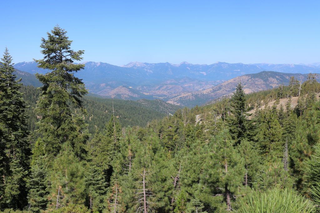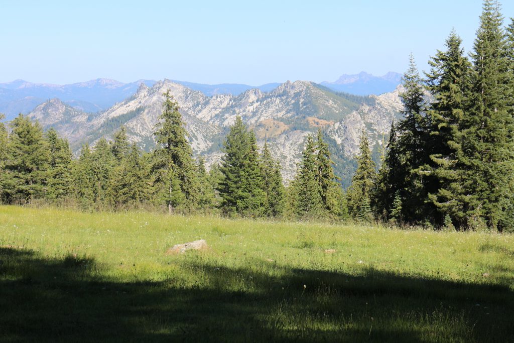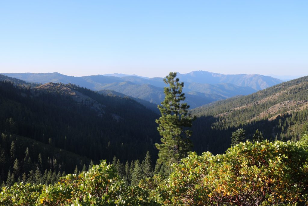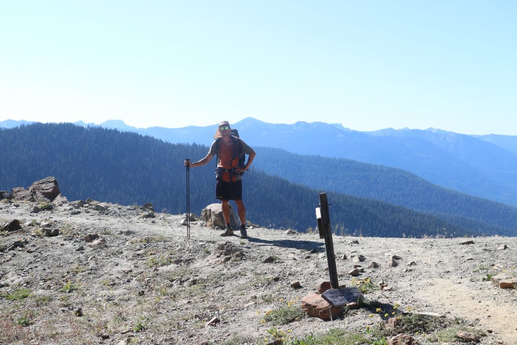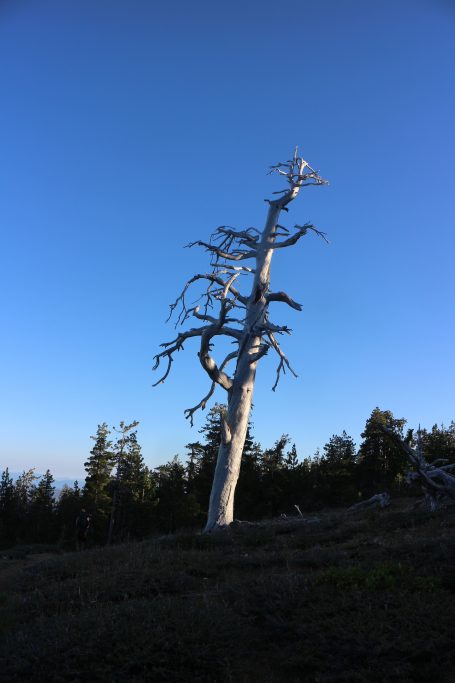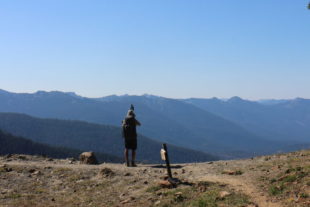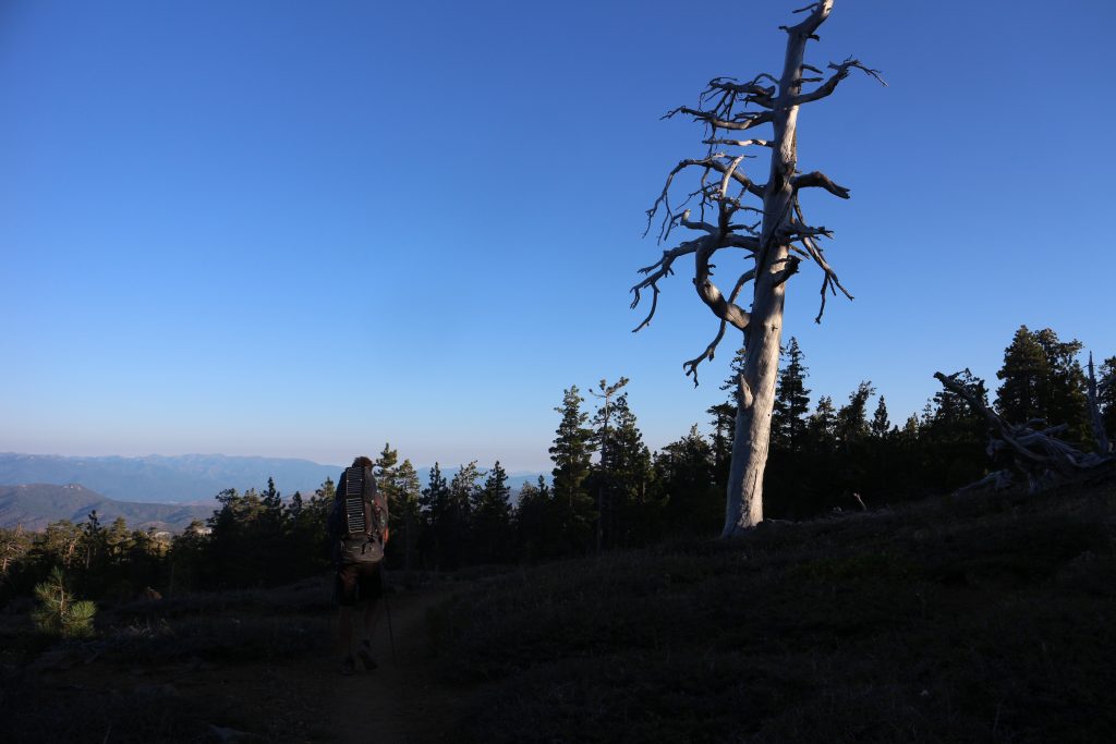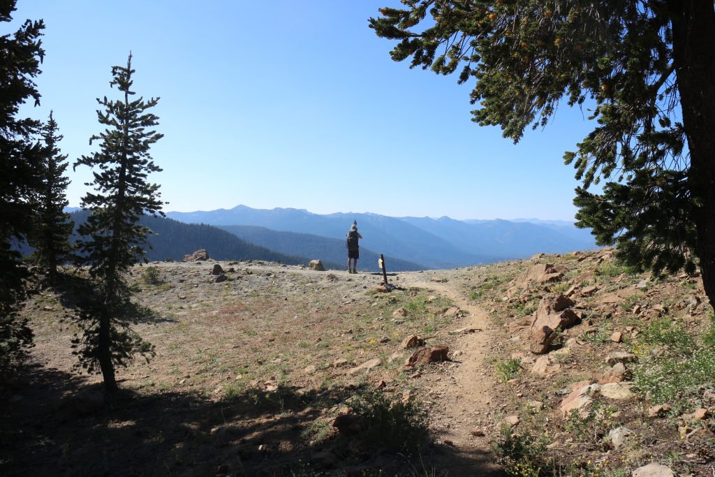Vi tältar uppe på ett pass vid Fox Creek Ridge trail junction. Fnösktorr mark med granar runt om.