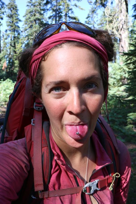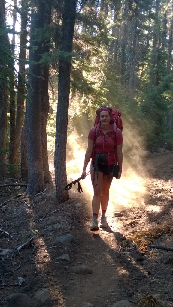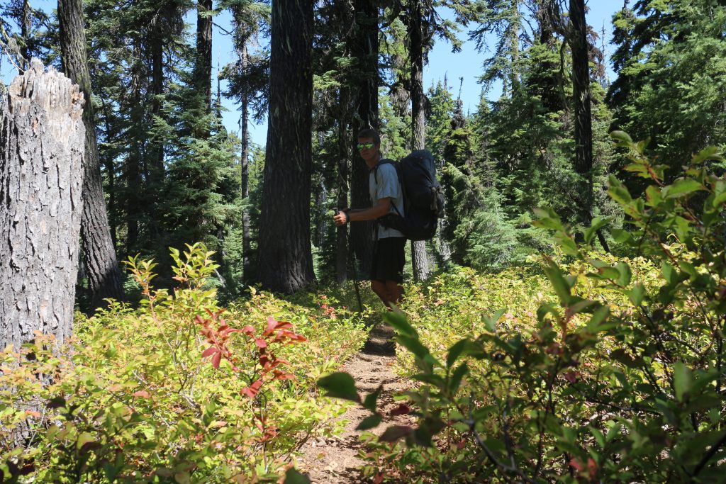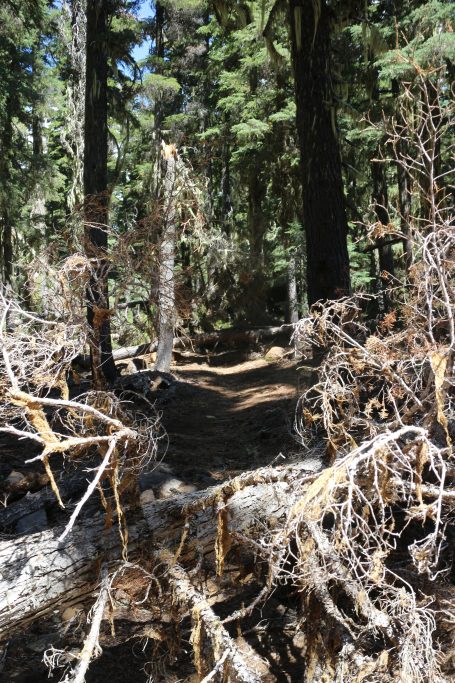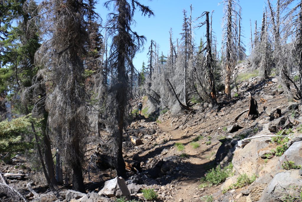 2/3 av dagens vandring går genom fnösktorr och jorddammig plockepinnskog, mängder med träd som stormfällts och ligger över stigen. Senare på dagen stora områden med brandhärjad, död skog. Vi plockar en del Huckleberrys, som färgar våra tungor,som växte i dom grönare partierna av skogsvandringen.