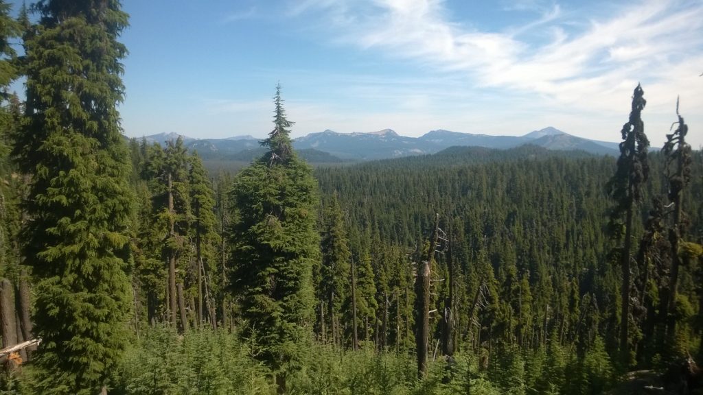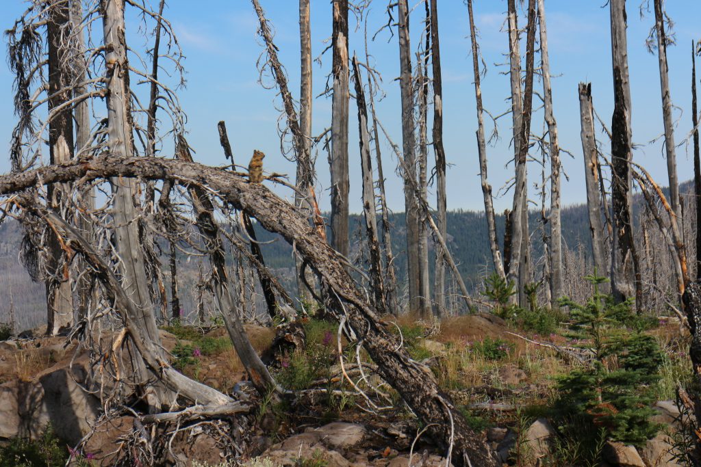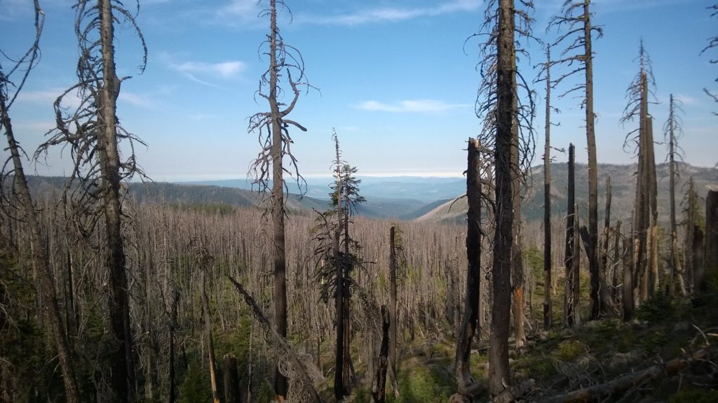 Dagens mål var att ta sig genom den stormfällda skogen (hinderbana över och under stockar om vartannat) och sen genom stora brandförstörda partier. Så långt har Oregons natur/vandring varit rätt så trist om jag ska vara ärlig, hittills har det mest varit genom torr, dammig och rätt så livlös skog.
