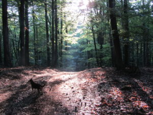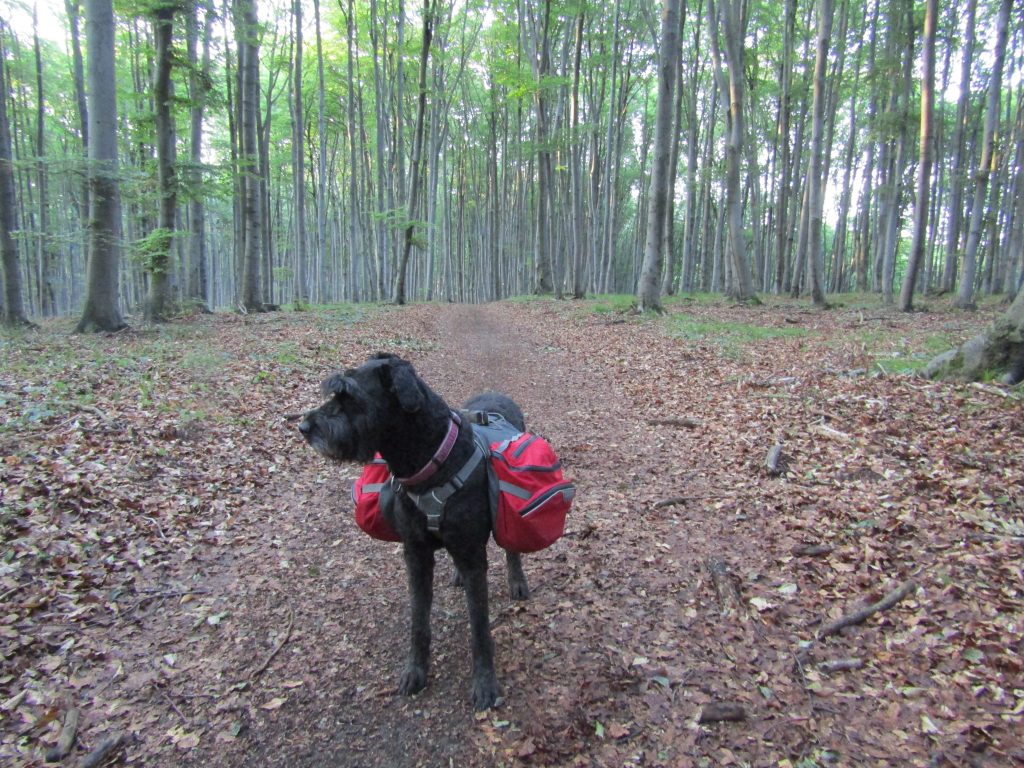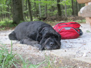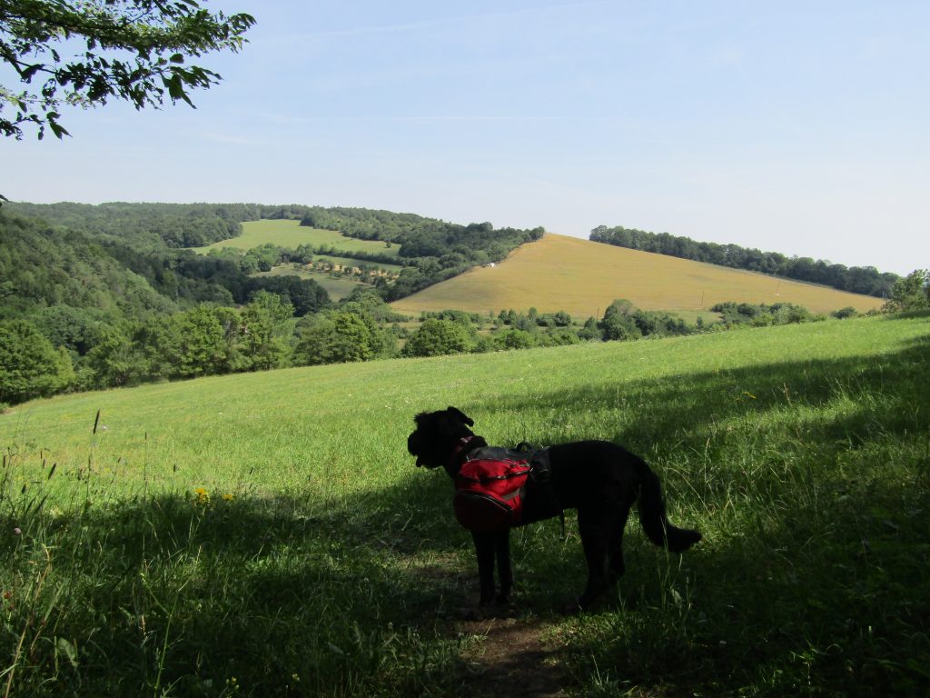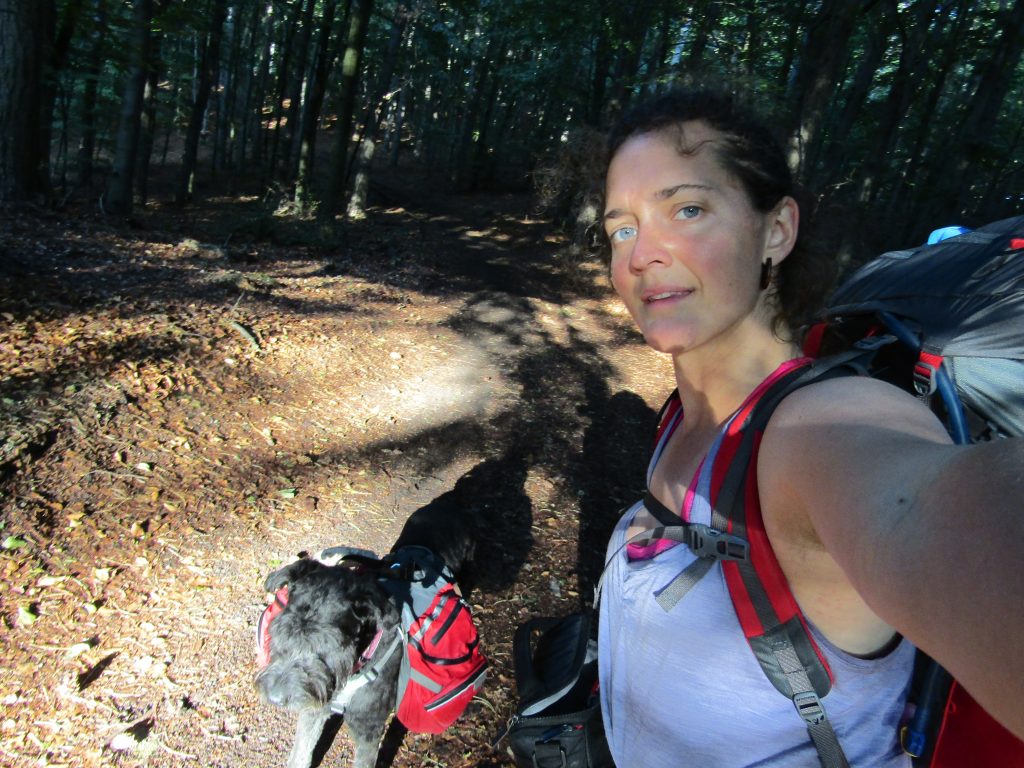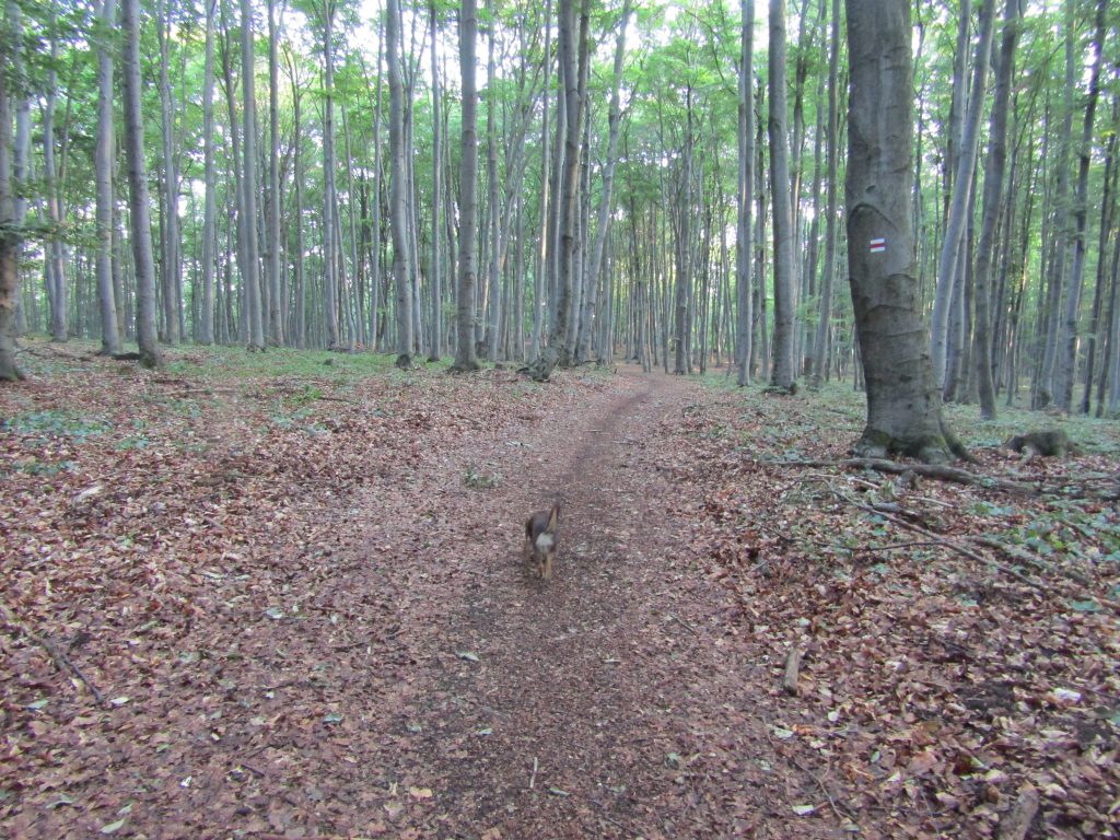 Anmarschen till centrum var som tur var längre än vägen ut. Ca 1 kilometer var vi tvungna att gå i värmen innan vi fick skydd från solen i skog. Trots skugga var det varmt så när vi gick uppför den rätt så branta backen till Bradlo rann svetten på mig och hundarnas tungor hängde långa.