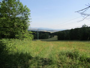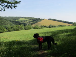Det är i regel mindre ansträngande att gå nedför än uppför. Men det blev för varmt. Vi tog därför en längre paus under några träd där någon så passande hängt upp en gunga. Jag gungade och hundarna låg platta på marken. När vi alla tre blivit lite svalare igen gick vi vidare ner till Jandova. En del av sträckan gick över en äng. Tur att dom passagerna är få och korta och det mesta av leden går genom skog..
