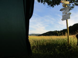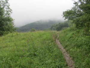 Vi går på till Zliechov, kartan sa att vi passerade några utsiktsplatser. Men nån utsikt hade vi inte. Allt var bara grått. I Zliechov stannade vi till utanför den lilla butiken. Först trodde jag att den var stängd. Det var helt svart där inne. Visade sig att nattens åskoväder tagit strömmen. Jag fick dock handlar det jag skulle. Satt länge utanför efteråt och funderade på hur jag skulle göra. Stanna under tak tills att det förhoppningsvis skulle lugna sig med regnet eller bara gå. Jag kollade väderleksprognosen. Regnet skulle sluta helt på eftermiddagen så jag avvaktade. Efter en dryg timme duggade det bara så då gick vi.