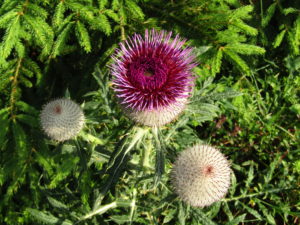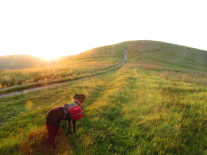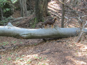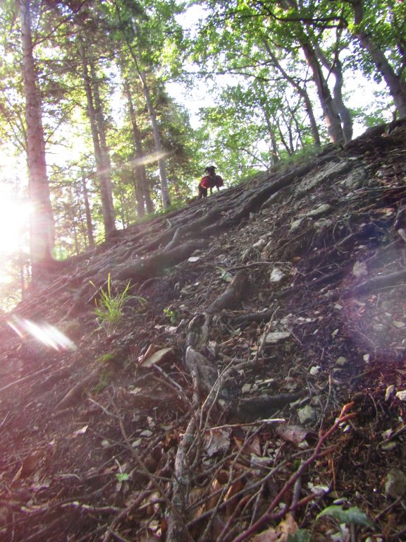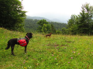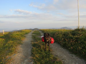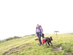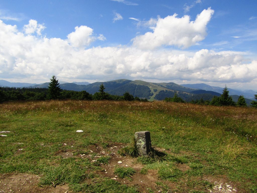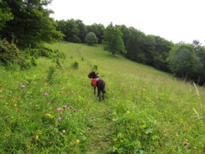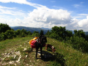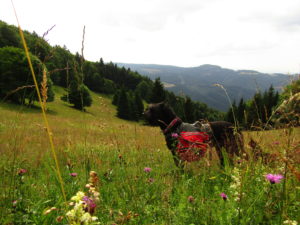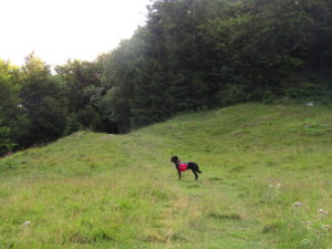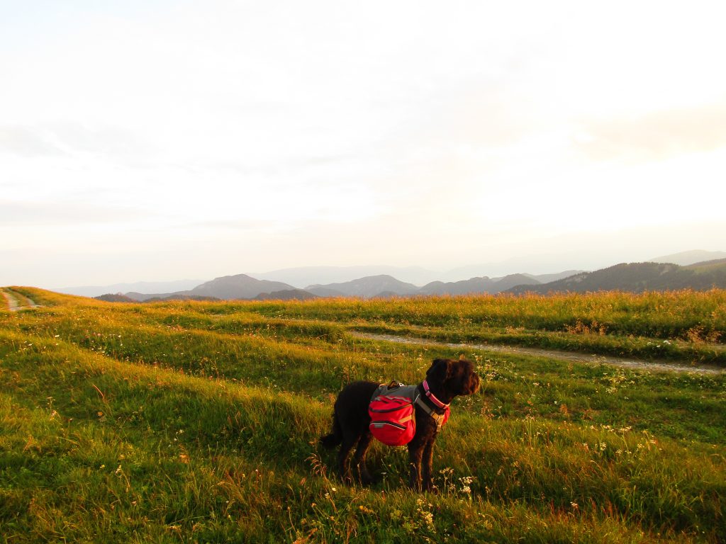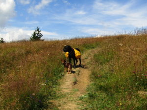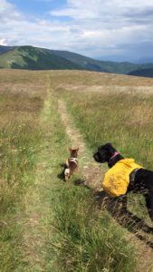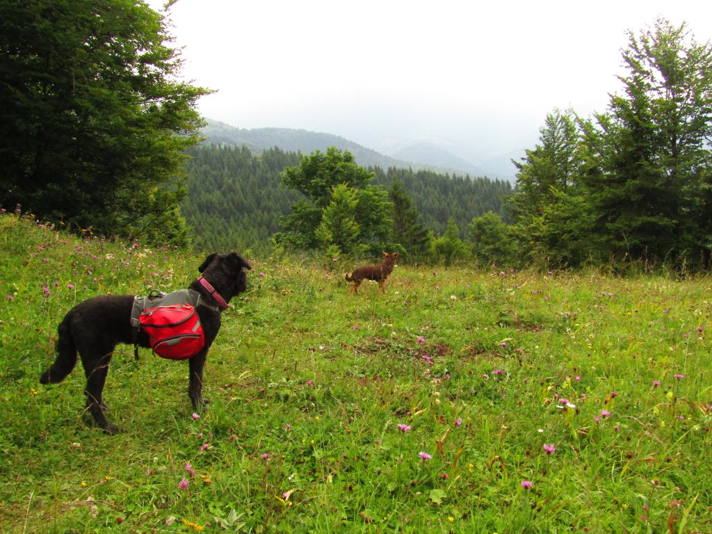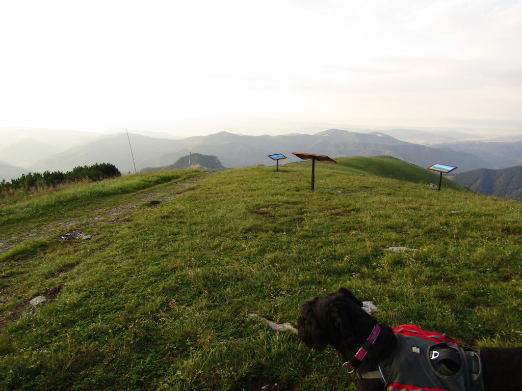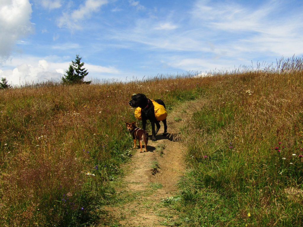 Vi följde asfaltsvägen till Polianky. Bounty var som vanligt svår att motivera till asfaltsgång. Hon blir som en snigel. Hon går låååångsamt.. men så snart vi kom in i skogen blev det full fart på henne igen. Vi hann dock inte långt förrän vi hamnade i en ny regnskur. På med regnkläder och regnskydd. Som tur var varade regnet bara en timma, sen blev det soligt och fint igen. Efter några hundra höjdmetrar var vi ute från skogen och vandring med underbara vyer väntade. Galet vackert! Först upp till Kecka, 1225 möh och sen Kozi Chrbat 1330 möh. Jag älskar dessa blomstrande kullar!