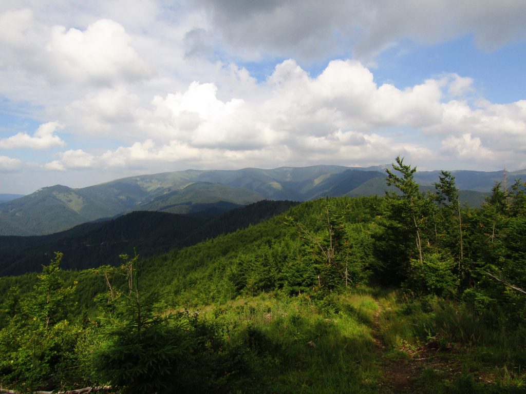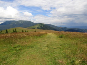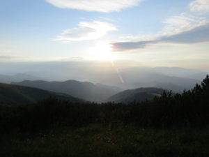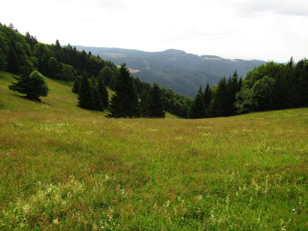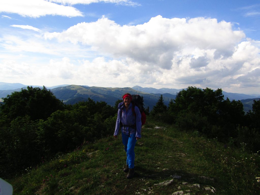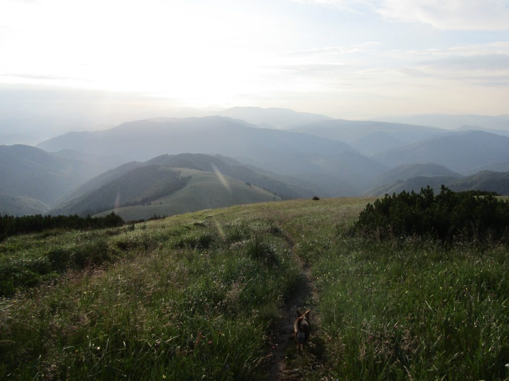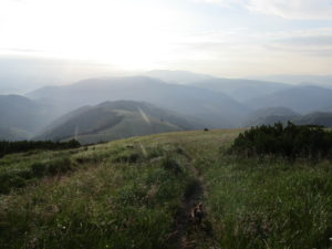 Efter en kort stunds vandrande nådde vi toppen av Krizna, 1574 möh. Satte mig och bara insöp allt det vackra en lång stund innan vi gick ner till Rybovske Sedlo där ett par fårherdar höll på att fixa med sina får i den tidiga morgontimman. Strax därefter hamnade vi i skog igen. Bitvis väldigt mycket skog. Så mycket skog att sen vuxit sig in på stigen och dolde den väl. Även denna skog bjöd på flera branta upp- och nedförsbackar. Leden växlade mellan att gå genom skog och vackra ängspartier som stod i full blom. På flera av dessa ängar var jag bara tvungen att sätta mig för att titta ännu mer på allt det vackra!