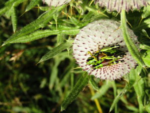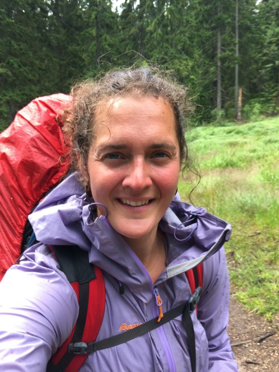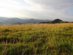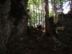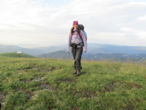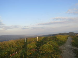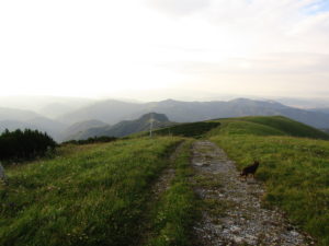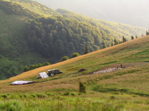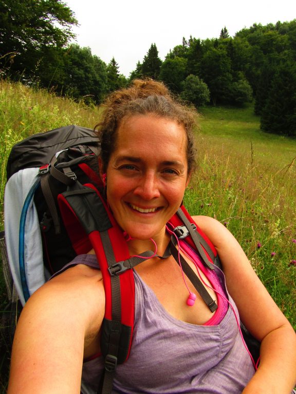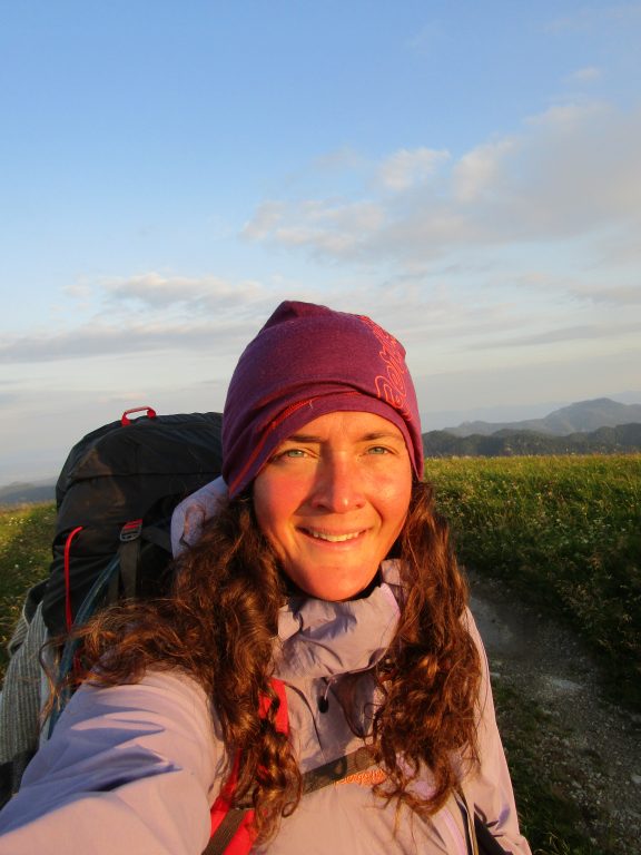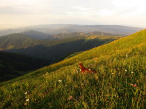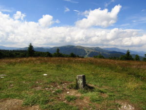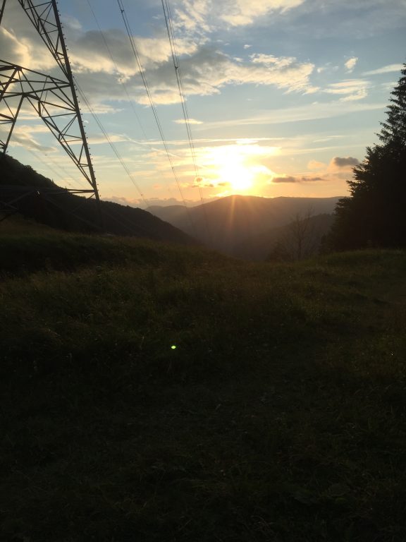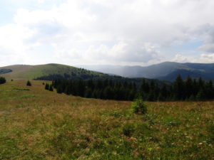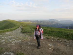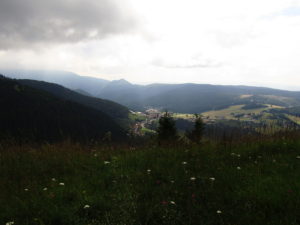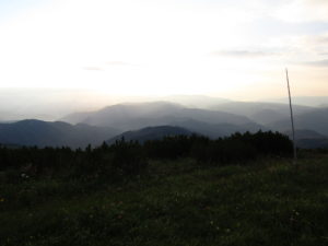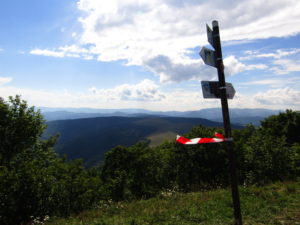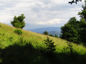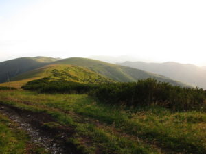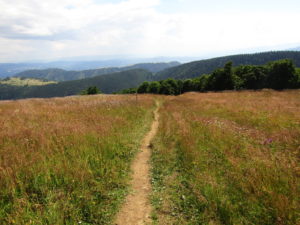 Efter en kort stunds vandrande nådde vi toppen av Krizna, 1574 möh. Satte mig och bara insöp allt det vackra en lång stund innan vi gick ner till Rybovske Sedlo där ett par fårherdar höll på att fixa med sina får i den tidiga morgontimman. Strax därefter hamnade vi i skog igen. Bitvis väldigt mycket skog. Så mycket skog att sen vuxit sig in på stigen och dolde den väl. Även denna skog bjöd på flera branta upp- och nedförsbackar. Leden växlade mellan att gå genom skog och vackra ängspartier som stod i full blom. På flera av dessa ängar var jag bara tvungen att sätta mig för att titta ännu mer på allt det vackra!