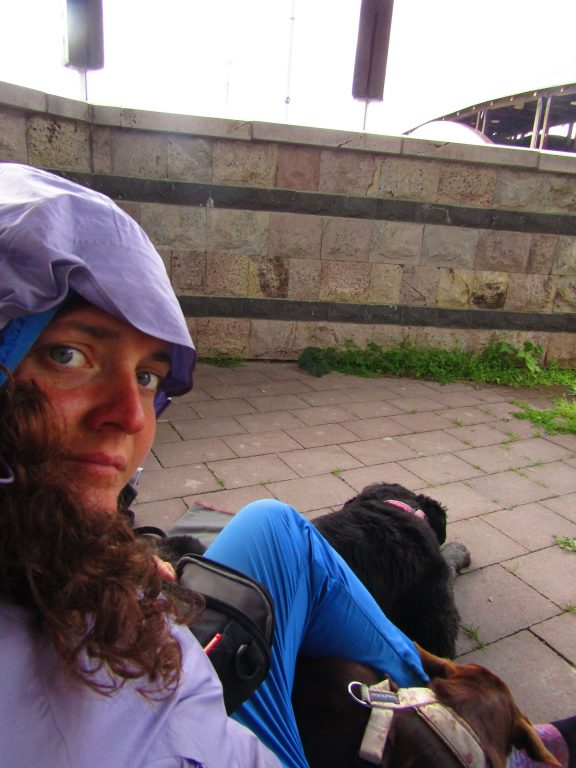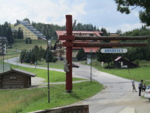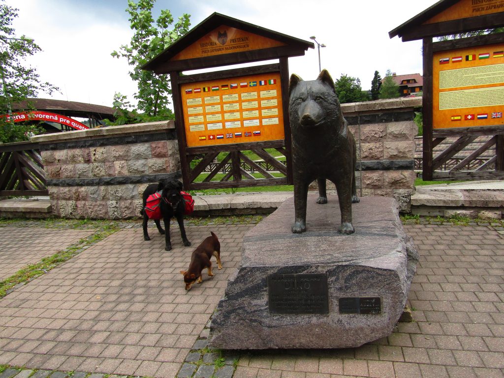 När vi närmade oss Donovaly började tunga regnmoln täcka allt mer av himlen. Att regn skulle börja falla var inte en fråga om om, bara när. Men vi klarade oss hela vägen till samhället. Jag köpte mat till mig och hundarna på minimarketen och gick till turistinformationen för att få hjälp att ladda batterier. Är det något jag lärt mig är det att man bör passa på när tillfälle ges. Tur var nog det. Hann inte mer än komma in på turistbyrån förrän regnet började falla. Jag och hundarna satte oss under tak och väntade ut regnet medan mina elprylar laddades. Efter nästan två timmar gav det med sig och vi kunde fortsätta att gå.