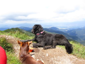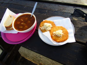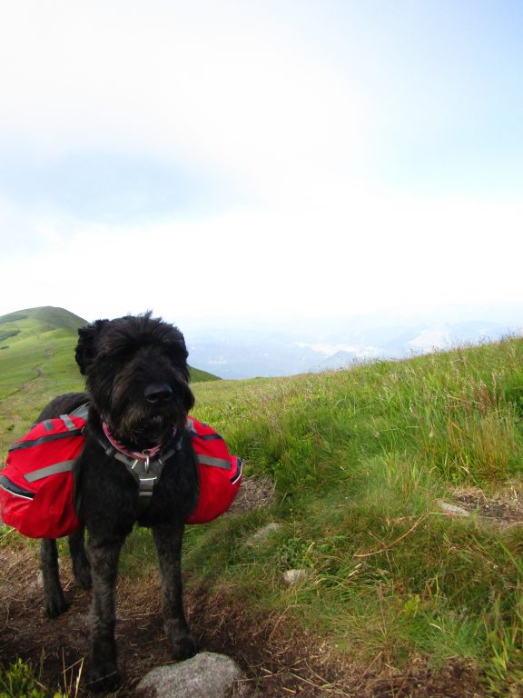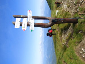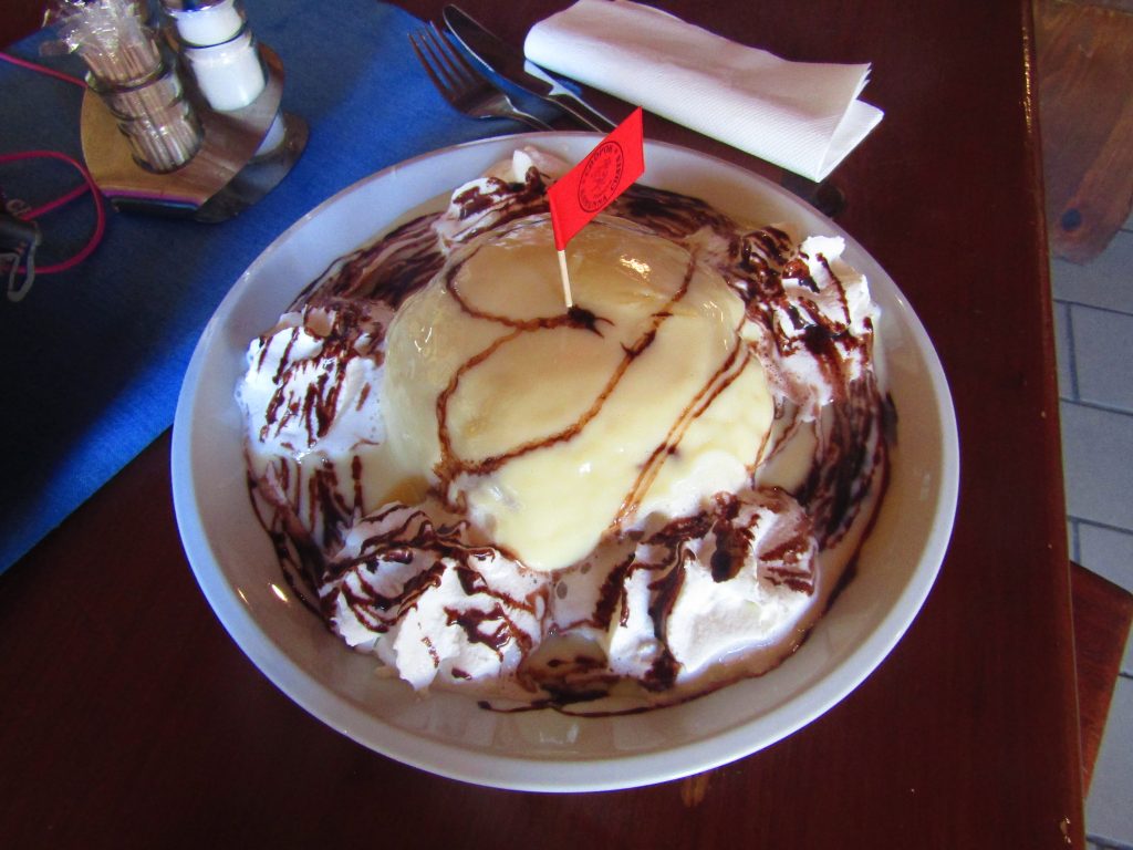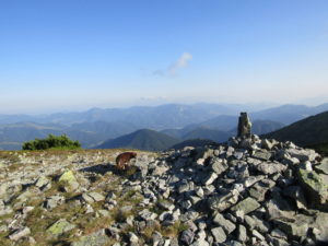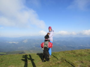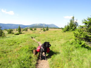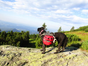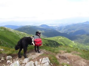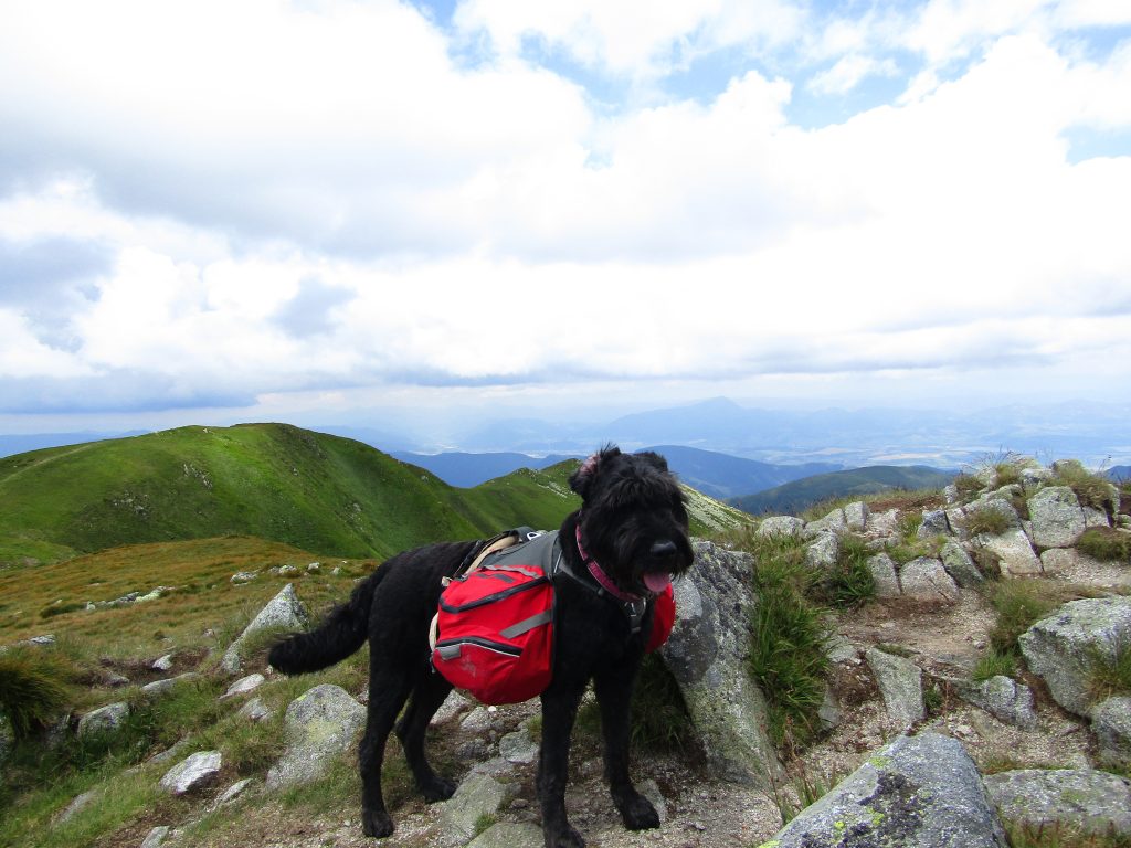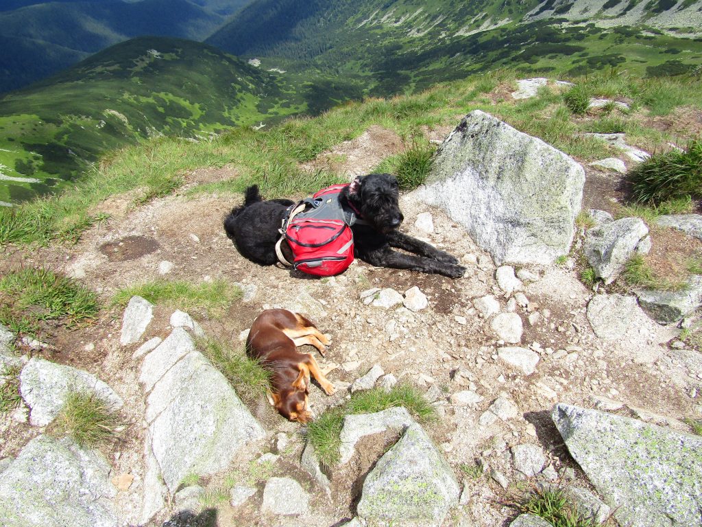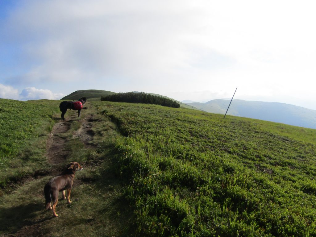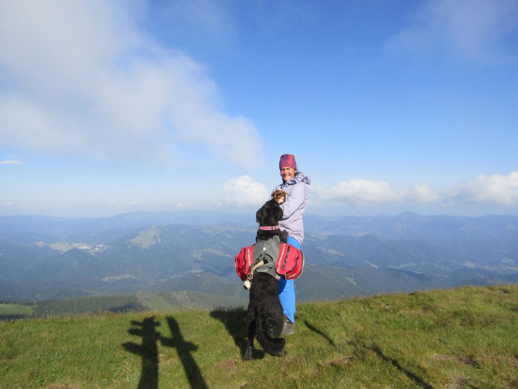 Vid Chopok når vi dagens högsta punkt 2024 möh. På 2000 möh finns en restaurang och det går även gondolbana dit upp så en söndag som denna var det väldigt mycket folk i området. Att gå dom 24 höjdmetrarna till toppen fick man göra i kö. Efter att ha varit på toppen satte jag mig i restaurangen och åt medan hundarna låg och sov under bordet. Jag beställde in nån specialrätt från området, dumblings. Eller en stor brödbit med plommonfyllning och täckt med vaniljsås, grädde och chokladsås. Minst sagt mäktig.