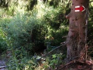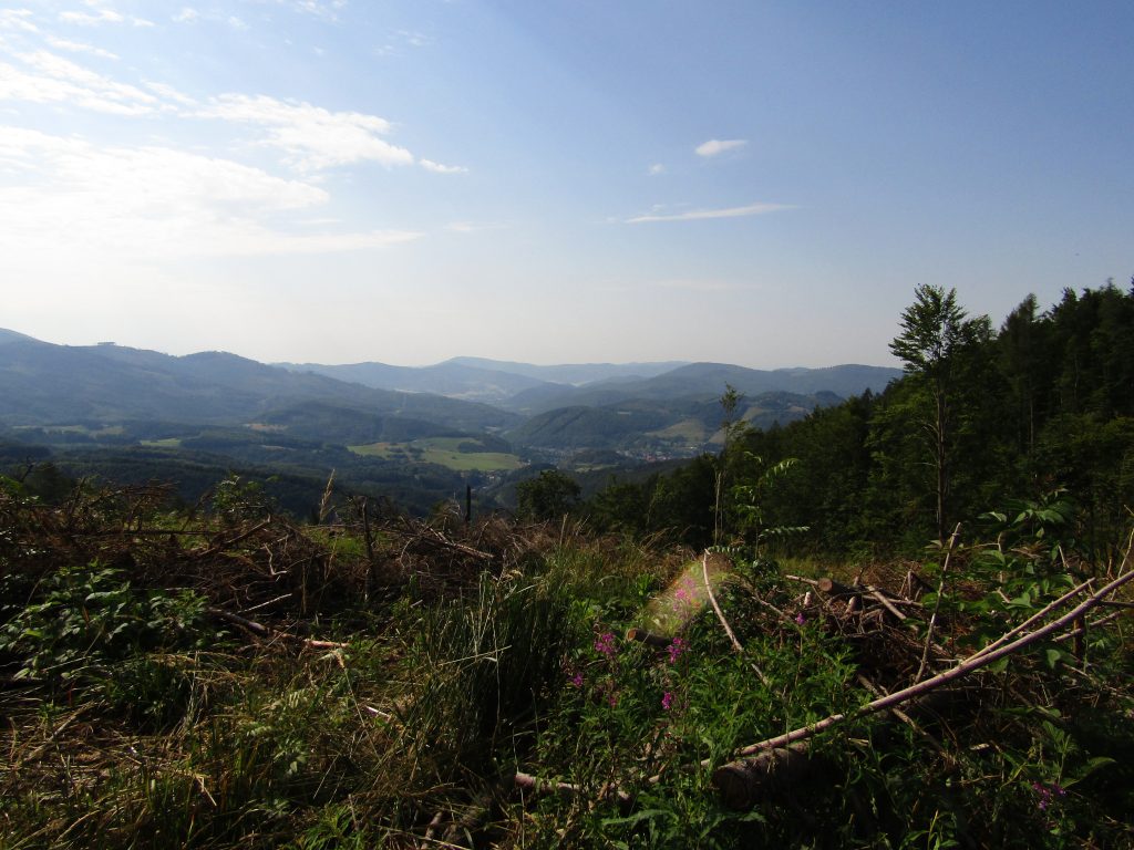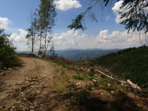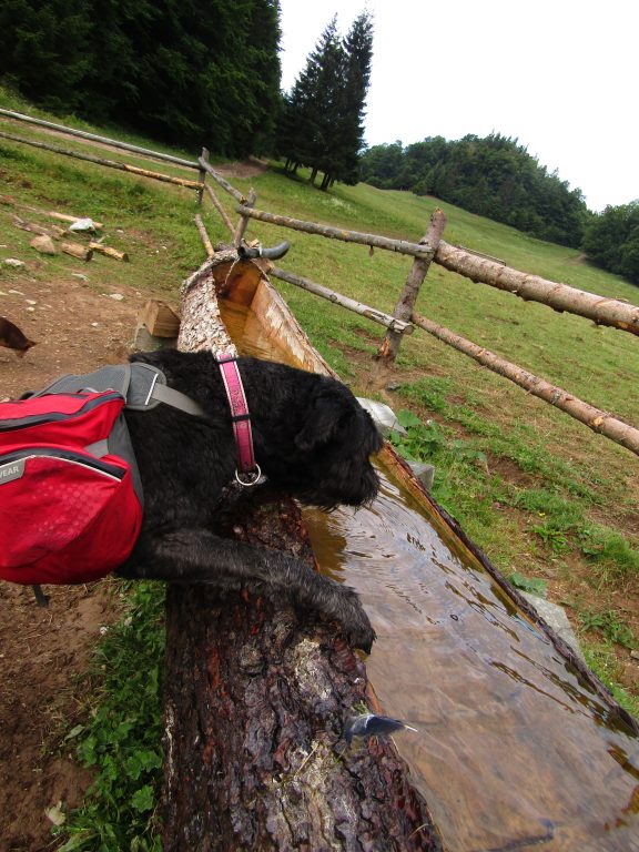 När man ska korsa hyggen och annat som inte erbjuder skugga får man ha en plan. Min såg ut på följande sett. Gå på målmedvetet till nästa skuggplats och stanna på den ca 10 min och fortsätt så. Det för att hundarna skulle få chansen att svalka sig lite. Vatten har det inte varit ett överflöd idag så när vi passerade en bäck som inte var utmärkt kartan på väg upp mot Chata pod Stromisom blev jag galet glad och kände enorm tacksamhet. Jag klädde av mig och satte mig och badade i det decimeterdjupa vattnet. Så skönt!