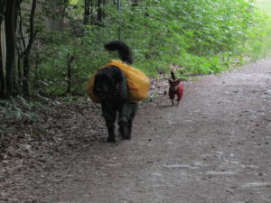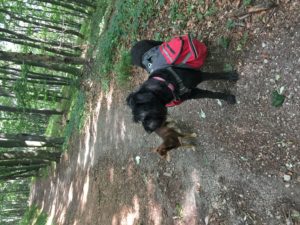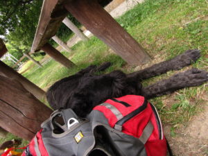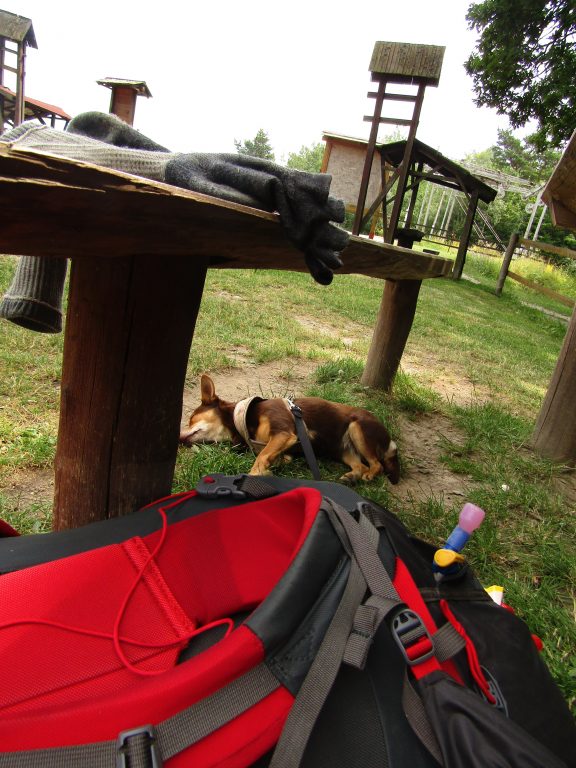 Efter två timmars paus drog tunga svarta moln in och ett åskväder kom in. Skönt att sitta under tak och vänta ut regent! Två timmar efter det kunde vi gå igen. Härlig vandring genom skog väntade. Vi gick på upp till Sedlo Repy där pausade vi innan vi gick ner till Janosikova Basta. Vacker tältplats med galet vacker utsikt. Satt länge och bara njöt av den medan hundarna slappade i skuggan. Dom gör det verkligen bra!