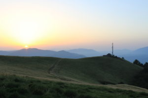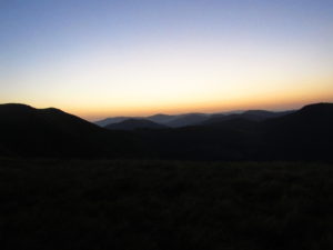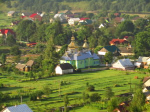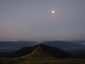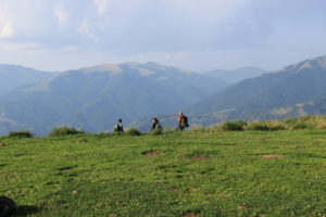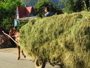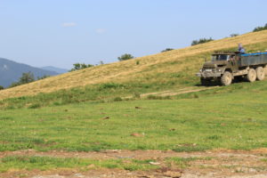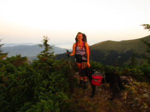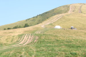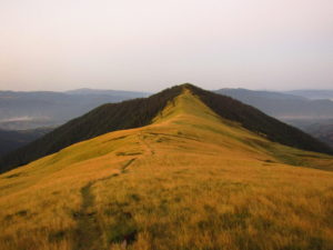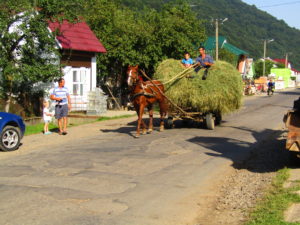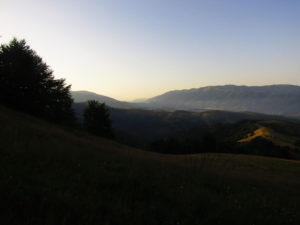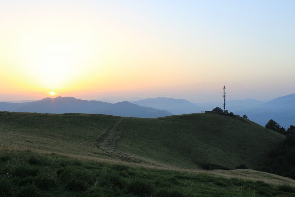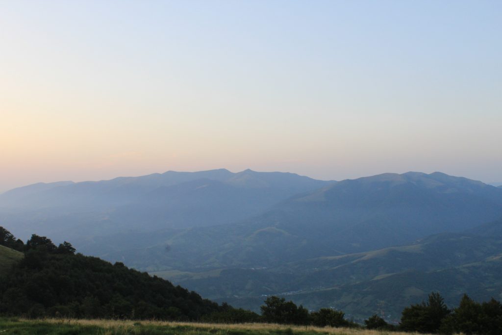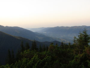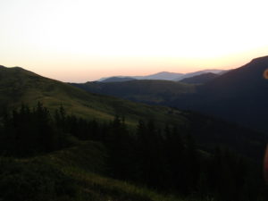 Natten var varm och det var riktigt varmt när vi började gå vid 5. Prognosen lovade temperaturen på över 30 grader idag och det slog in. Vi följde den gräsklädda ryggen till en början nedåt och sen upp över Барвінок, 1461 möh. Där tog skogen vid. På brant stig gick vi så ned mot Колочава (Kolochava). Bitvis var det småtrixigt att gå då stenarna på stigen hela tiden rullade undan då man klev på dom. Vi kom ut på ängsmarker och gick ned över ängar till samhället. Vi stannar på första bästa minimarket/pub för att dricka Kvas. Den visade sig vara slut så det fick bli läsk och glass istället.