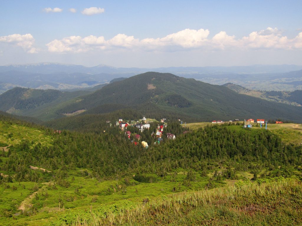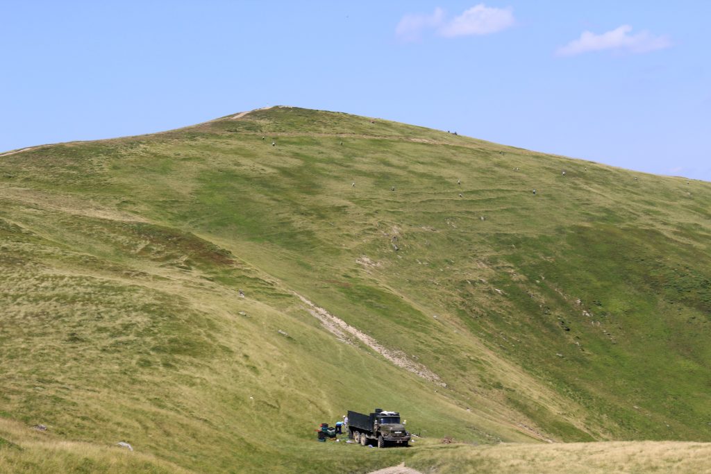 När vi närmade oss Драгобрате (Dragobrat) ökade mängden turister. Längs stigen trängdes nu vandrare, människor som tog promenader (efter att ha tagit liften upp), motorcyklister, minibussar, jeepar med blåbärsplockare.