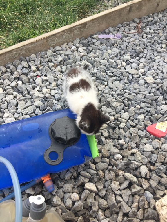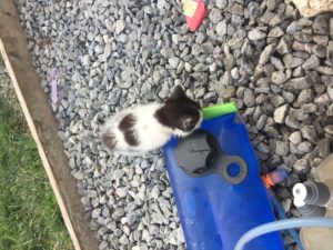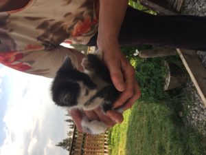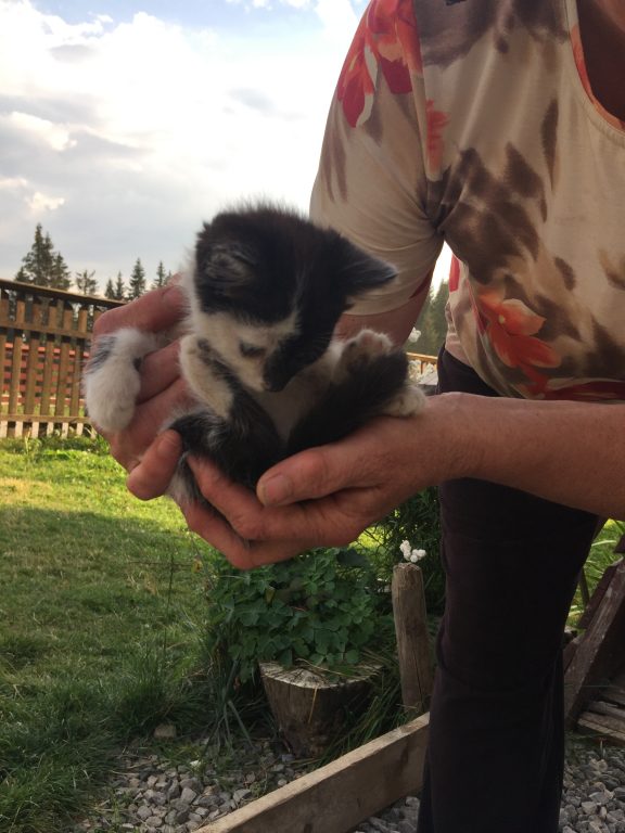 Resten av vägen ner till Pasul Rotunda, 1271 möh, gick längs grusväg. Vid Pasul Rotunda finns två pensionat, jag gick till det ena för att skaffa vatten. Jag mötte den gulligaste lilla kattungen. Man kan inte annat än att bli kär i 4 veckor gamla sötnötar.