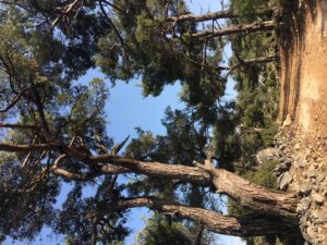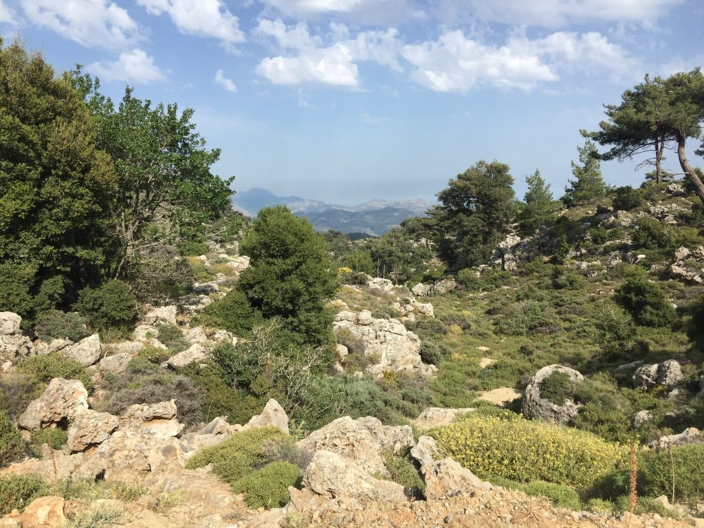 Efter en över två timmar lång paus gick vi vidare i tryckande hetta. Åska började mullra på avstånd men nådde aldrig oss. Som tur var började moln så småningom att täcka solen så att det blev lättare att gå uppåt. Vi vandrade på genom ett vackert landskap ofta tallbeklätt som ofta bjöd på fina vyer.