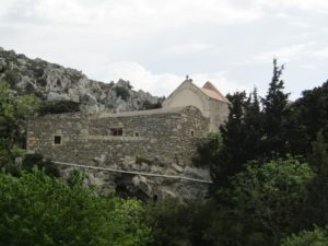 Efter att ha gått upp till 600 möh började vandringen ned mot Prina. Jag stannade till vid Panagiaklostret mest för att det fanns en kran vid grinden, för in till klosterområdet kommer man inte. Samma procedur som alltid vid kranen.