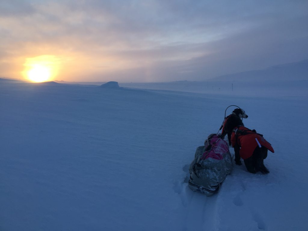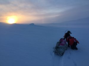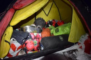 Enbart tre kilometer kvar till Pältsastugan slog jag läger. För mig känns det viktigt att turen är lustfylld för hundarna om inte hela tiden så åtminstone majoriteten av den. Peak började se trött ut och det förstår jag efter alla backar och spårande idag. Stighuden som lossnade för mig igår lossnade idag med vid den förra uppförsbacken. Visst att man kan saxa uppför backar, men det är så mycket jobbigare. Det är bara ca 60 höjdmeter kvar tills det går utför resten av vägen till Pältsastugan. Men dom får vänta tills imorn. Hundarna såg väldigt nöjda ut när dom fick krypa in i tältet och kura ihop sig på sina fällar.