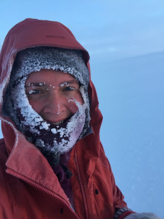 Vi fick en rätt så blåsig start på dagen därför var jag tvungen att klä på Vega hennes regnoverall så att det inte ska fastna så mycket snö i pälsen och ett värmetäcke utanpå det. Bounty bäddade jag ner ordentligt i pulkan. Först la jag henne tillrätta i hennes sovsäck och sen lindade jag renskinnet runt paketet. Hon ser ut att ha haft det rätt så bra!