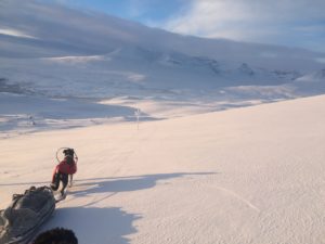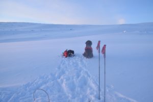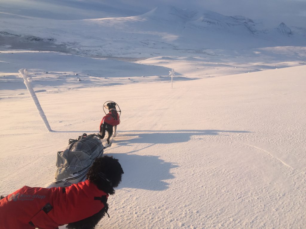Beslutet att stanna igår visade sig vara det rätta. 60 höjdmeter låter inte mycket. Men dom tog minst sagt tid och energi. Jag fick gå dubbla vändor. Först kopplade jag mig framför Peak så att vi tillsammans drog upp hans pulka förbi några ledkryss. Sen kopplade jag lös honom så att han fick vila lite och åkte ner för att hämta min. Den gick så jäkla tungt! Ofta klarade jag inte mer än 10 steg åt gången med högerbenet innan jag var tvungen att hämta andan. Att bara gå för att få med den upp gick inte, istället var jag tvungen att jucka till vid varje steg för att få den med mig.