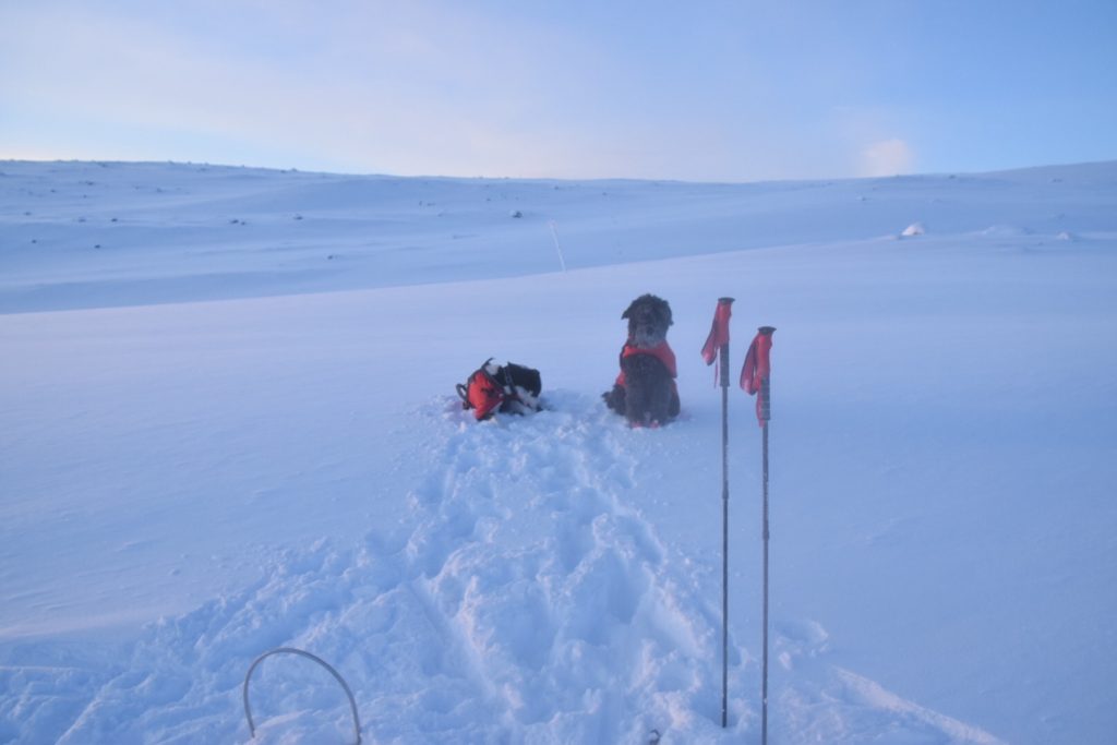 Efter att vi efter mycket möda tagit oss till toppen väntade i stort sett bara nedförsbackar hela vägen till Pältsastugan. Men inte heller nedför gick det särskilt lätt. Pulkorna gled dåligt på snön som på många platser inte bar alls. Men fram kom vi! Jag måste däremot erkänna att jag blev väldigt besviken när jag kom fram. Jag hade hoppats på att kunna göra en brasa att värma mig vid och få saker som blivit fuktiga att torka. Men icke! Av någon anledning har man valt att sätta lås och bom på Pältsastugans vedförråd! Gasen var som tur var igång så att jag åtminstone kunde smälta snö till vatten. För att bli på lite bättre humör så gjorde jag stekpannebröd som jag serverade med stora mängder smör. Vega och Bounty äter bra, men jag är lite bekymrad över Peak som äter mindre mot vad jag räknat med.