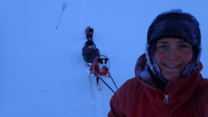 Att spåra är verkligen tungt. När vi kommit ca 500 meter efter Pältsa fick jag tänka om. Vi kom verkligen ingenstans. Lösningen blev att jag bytte drag på den stora pulkan till ett hunddrag, kopplade fast Peak i det och Vega i den lilla pulkan. Jag kopplade mig framför Peak så tillsammans drog vi den stora pulkan och Vega gick bakom oss med den lilla. Det fungerade rätt så bra!