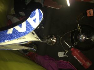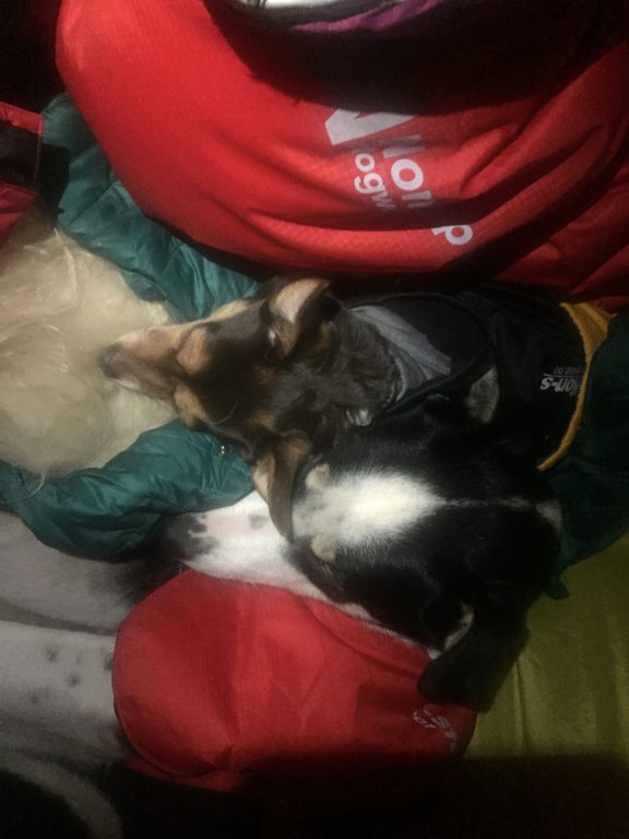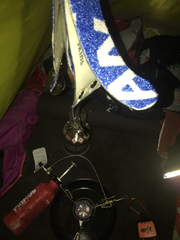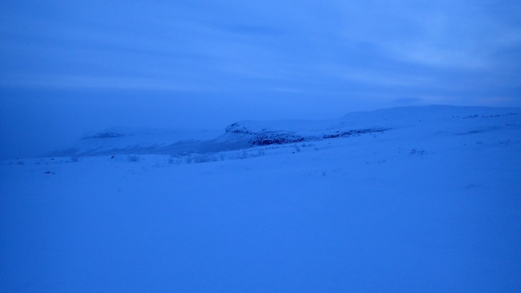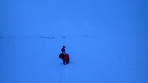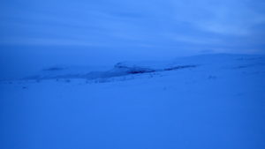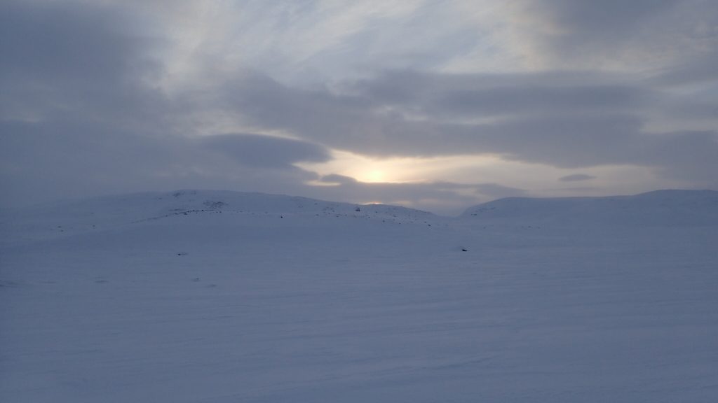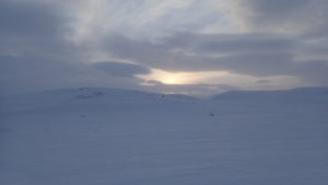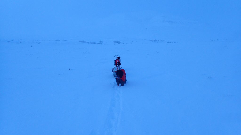 I höjd med Gobmevárri vek vi av från leden och tog sikte mot Rr 289. Sikten var inte hundra procent med oss. Eller sikten var ok, men det var svårt att se konturer och därför läsa av landskapet. Var backar fanns osv. Men det gick bra. Vi kom fram till röset! Därefter blev det lite jobbigare att ta sig fram igen. Fram till röset var det lätt utför majoriteten av tiden, bara små kullar här och där. Jag hade redan halvväg bytt plats på Vega och Peak för att jobbighetsgraden för dom skulle växla. Men efter röset väntade uppförsbackar igenom. Det var endast 60 höjdmeter. Men jäklar så tunga dom var. Desto större var glädjen när vi nådde toppen av passet och skulle utför. Men även utför gick det tungt i snö som inte ville bära. Sista 20 höjdmetrarna uppför drog jag stora pulkan själv och det gick på något vis. Lite leds blev jag allt sen nedför när jag liksom inte fick lön för mödan då jag fick dra pulkan även där. Men det som var värst, det var att när vi kommit ner för första backen gick toppfästena till båda stighudarna sönder. Det är inga problem att byta. Jag byter bara ut dom mot en bit repsnöre. Men det måste göras när stighudarna är varma så att klistret under dom fastnar. Så det var bara ett att göra. Slå upp tältet. Kanske hade vi inte tagit oss mycket längre idag iaf. Hundarna kändes trötta när vi var här. Nu ligger dom och sover på varsin fäll och ser ut att må rätt så gott. Peak åt förresten bra igår. Hoppas att han tänkt att göra det ikväll med.