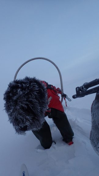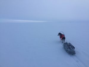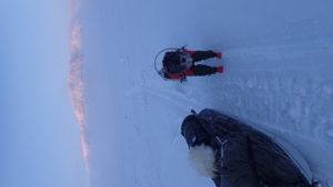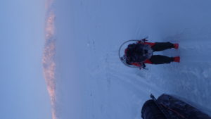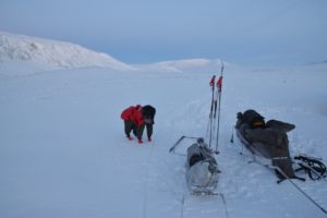 Det klara vädret som var precis när vi startade försvann snabbt och ersattes av gråväder. Snart var hela landskapet täckt av dimma som gjorde det allt svårare att gå på kompassriktning då det var svårt att hitta punkter att orientera mot när allt var vitt. Det började därför ta allt längre tid att komma framåt. Men vi kämpade på. Sista två kilometerna var dock jobbiga för oss alla. Så lyckan kändes desto större när jag fick syn på ledkryssen mellan dom två sjöarna som vi tältar intill i natt. Jag måste däremot erkänna att jag blev lite lite besviken när jag kom fram till leden och såg att den var okörd av skotrar. Hade hoppats på att ett hårt och fint spår skulle vänta på oss.
