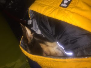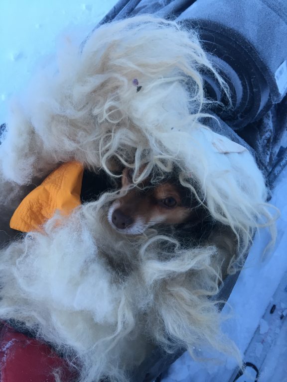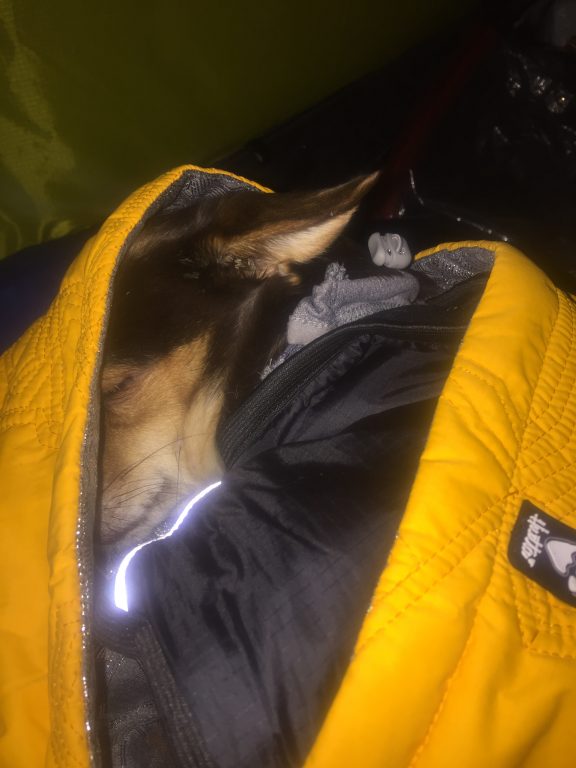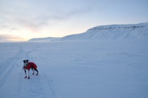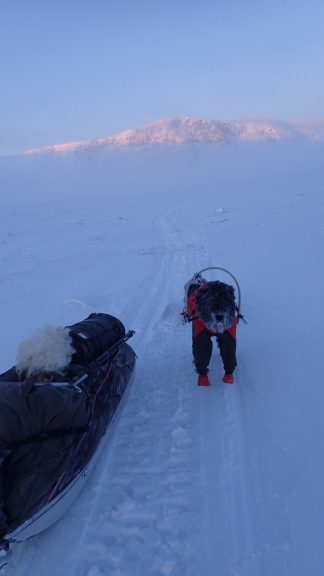 Det tar sin lilla tid att komma i ordning i tältet. Det är många småmoment som ska fixas innan jag kan slappna av. Vega och Peak ska tossorna och selarna bort från (Peak klarade sig första dagarna utan, men både idag och igår har det isat mellan trampdynorna på honom när han gått utan). Sen ska Vega byta täcken, bort med vindoverallen och på med fleeceoverallen samt ett mellantäcke och sist på med det röda täcket som hon även går med på dagen. Sen ska täcken bytas på Bounty. Det är fint att se hur snabbt alla tre vant sig vid rutinerna. Så snart allt detta är fixat lägger dom sig till rätta och slumrar fram tills det ät dags för dom att äta middag.
