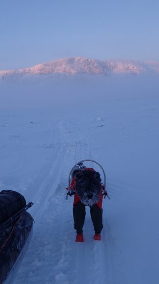 Vega och Peak drog en varsin pulka till att börja med medan jag skidade som en drottning helt fri! Föret var egentligen helt perfekt helt tills vi kom in i Sverige. Vi hann egentligen inte mer än korsa gränsen förrän det slutade att bära så bra som det gjort dittills. Det började att gå allt trögare, så vi hjälptes nu åt med den stora pulkan. Vega och Peak har turats om med båda uppgifterna.