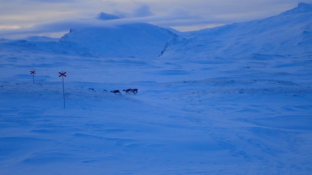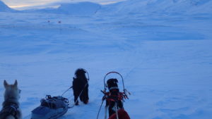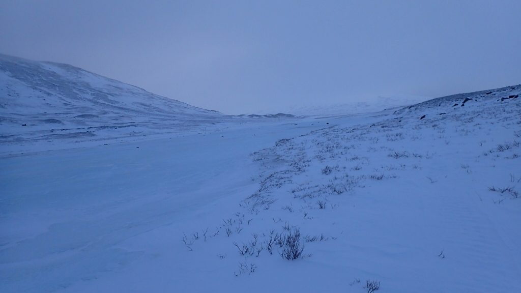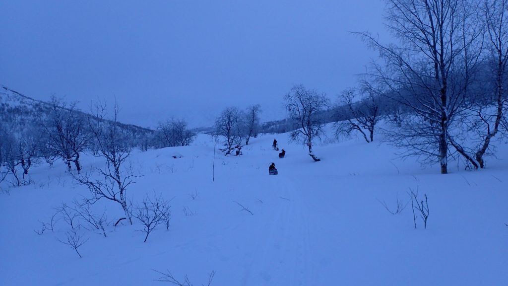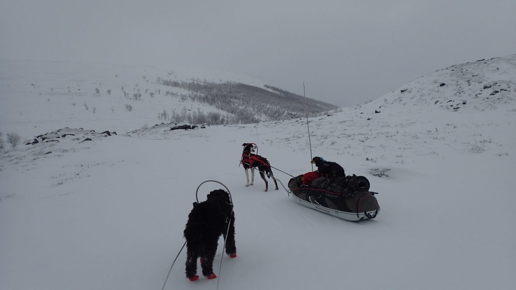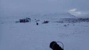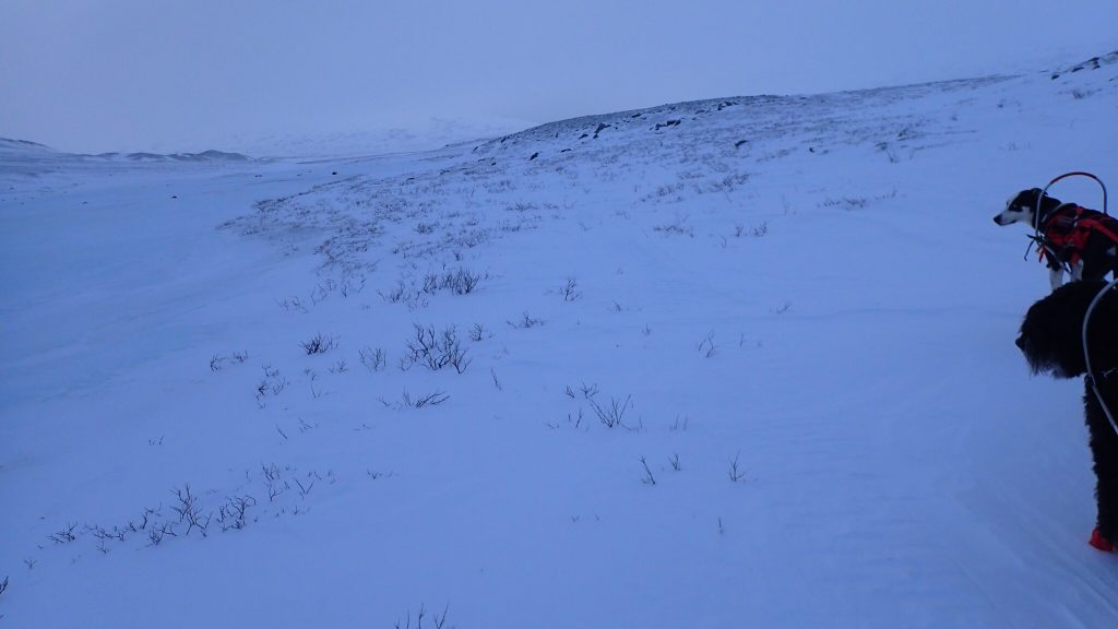 Efter att vi passerat Stuor-Jiertá så blev det allt mindre snö för oss att ta oss fram på. Men det fungerade på något vis. Men sen när vi kom in i björkskogen blev det jobbigare. Där blev problemet omvänt. Nu var det inte längre för lite snö, men för mycket lös snö som inte alls bar för hundarna. Det blev allt bökigare att ta sig fram. Från att ha hållit ett tempo på 5 km i timmen började vi att skida i ett tempo av ca 1 km i timmen. Jag är så oerhört imponerad över hundarna och deras kämparlust!