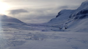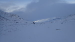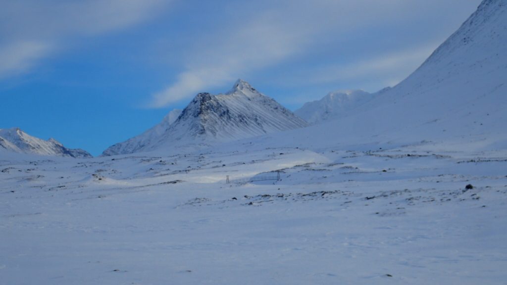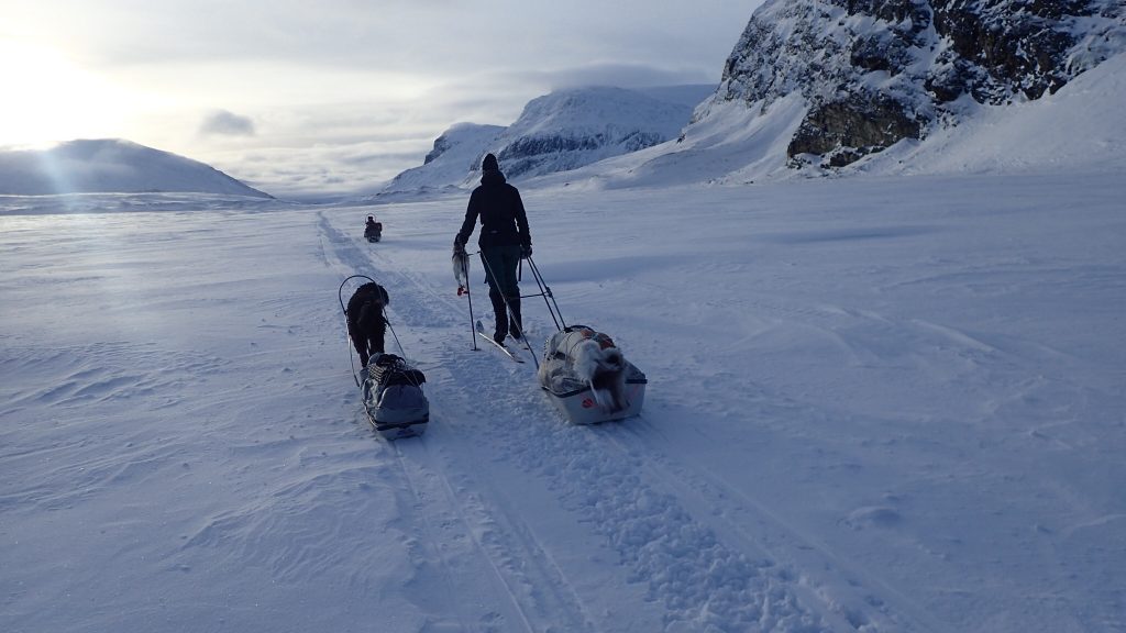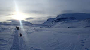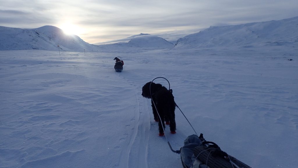 Peak drog den stora pulkan och Vega den lilla. Som det är lite uppför till en början så tänkte jag att Peak och jag kunde dra den stora pulkan tillsammans, men som han drog på så hårt så gick inte det och han drog den ensam istället så jag kunde lyxa igen. Strax innan vindskyddet Kuoperjåkkå så vek vi av från leden och sneddade mot bron som går över Tjäktjajåkkå. Platt, fint och härligt landskap att skida genom i ca 3 km. Efter bron blev det lite stökigare när vi hamnade på leden och det blev bara värre. Väldigt kuperat och väldigt stenigt. Det blev så illa att det inte gick längre så vi fick vika av från leden igen och istället köra mot vistet Kårtjevuolle. Därifrån gick det relativt lätt och fint att följa Tjäktjajåkkå. Kollade upp mot leden och undrar hur är det ens tänkt att man ska kunna skida längs den? Så mycket sten och så många kullar.