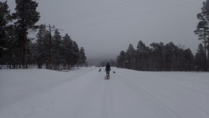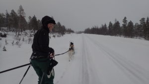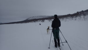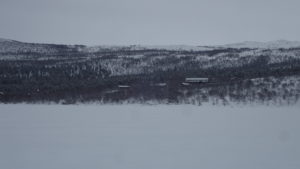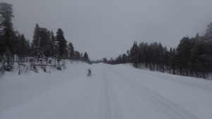 Pigga och utvilade lämnade vi anläggningen vid stora sjöfallet vid 8. Sjöisen här är förenad med livsfara att röra sig på (förutom vid utmarkerade leder) pga att den är så hårt reglerad. Vi var därför tvungna att skida längs bilvägen till Kebnats. Eller skida kunde vi inte göra, så vi gick. Risken att repa skidorna på gruskorn som fanns här och där var för stor. Det är inte många bilar som rör sig längs vägen den här tiden på året. Totalt mötte vi två stycken. Peak drog den lilla pulkan och jag och Vega drog den stor tillsammans. Att traska bilväg är i regel inte det roligaste. Men det går iaf lätt och smidigt att ta sig fram och med musik i öronen blev det ändå rätt så trevligt!