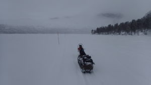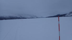 När man skidar över vattnet från Kebnats till Saltoloukta fjällstation är det oerhört viktigt att man följer markeringarna på isen slaviskt. Att vistas utanför den markerade leden är förenat med livsfara. Här tog Peak den stora pulkan och Vega den lilla medan jag fick skida helt utan att dra. Det gick snabbt och smidigt att skida över.