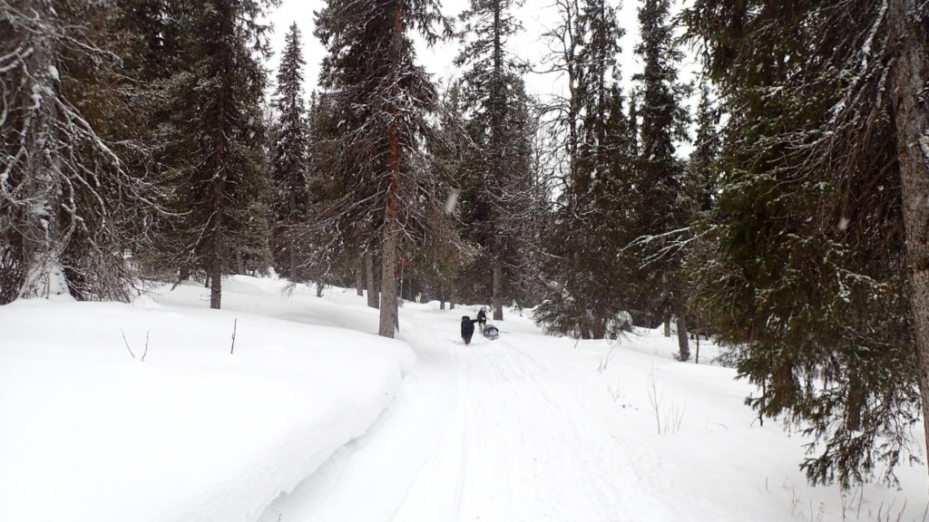 Vi skidade på genom skog sen. Föret blev allt trögare och snöfallet kom allt närmre. Vackert när det började falla men pulkorna hade börjat suga fast i snön. Jobbigt. Tur att det började gå nedför mot Kvikkjokk!