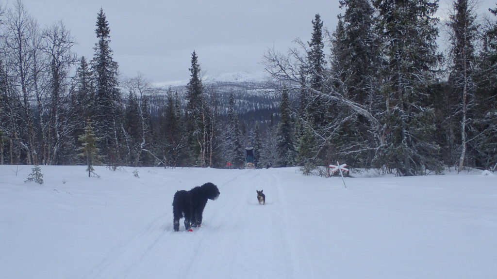 Just innan Unna Dáhtá såg vi en älg korsa sjön. Väldigt spännande att lukta på dess spår tyckte hundarna. Apropå spår så måste det ha varit jobbigt för den att korsa sjön då det var ca 1 dm vatten i alla spår den lämnade efter sig.