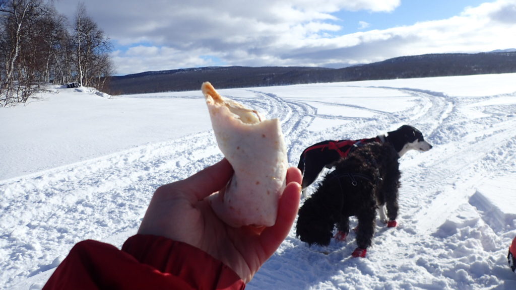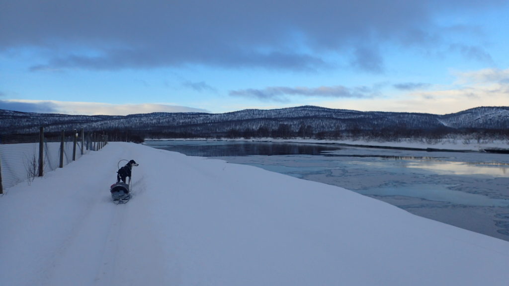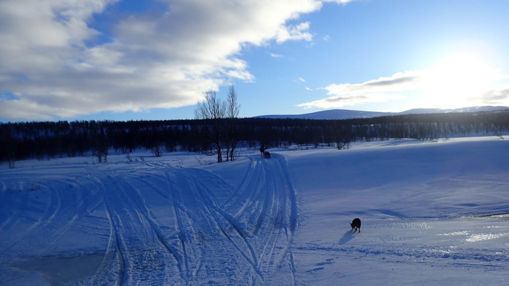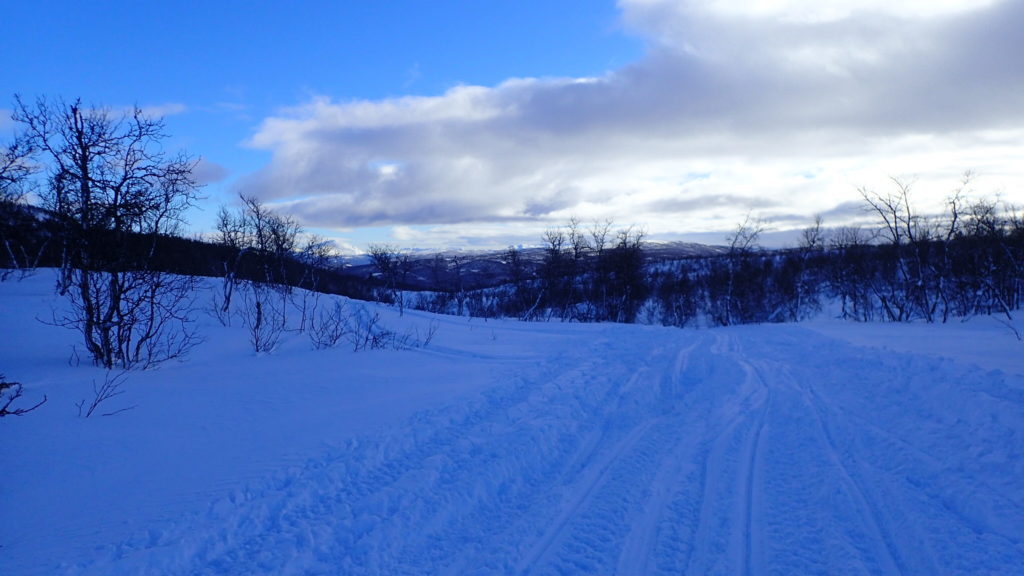 Det körs hur mycket skoter som helst här. Det var nog tur för oss för annars skulle det ha gått ännu trögare att ta sig fram. Några av tjärnarna hade vattnat igenom vilket resulterade i is på pulkorna som det byggde på snö på och pulkorna blev ännu trögare att dra. Har en skrapa med mig så använde den några gånger.