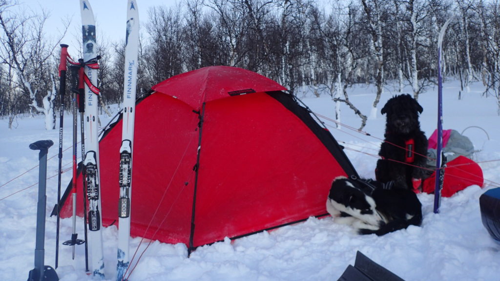 Suveränt med små steg och skoterspår. Hundarna har det lyxigt med eget tält, eller?
