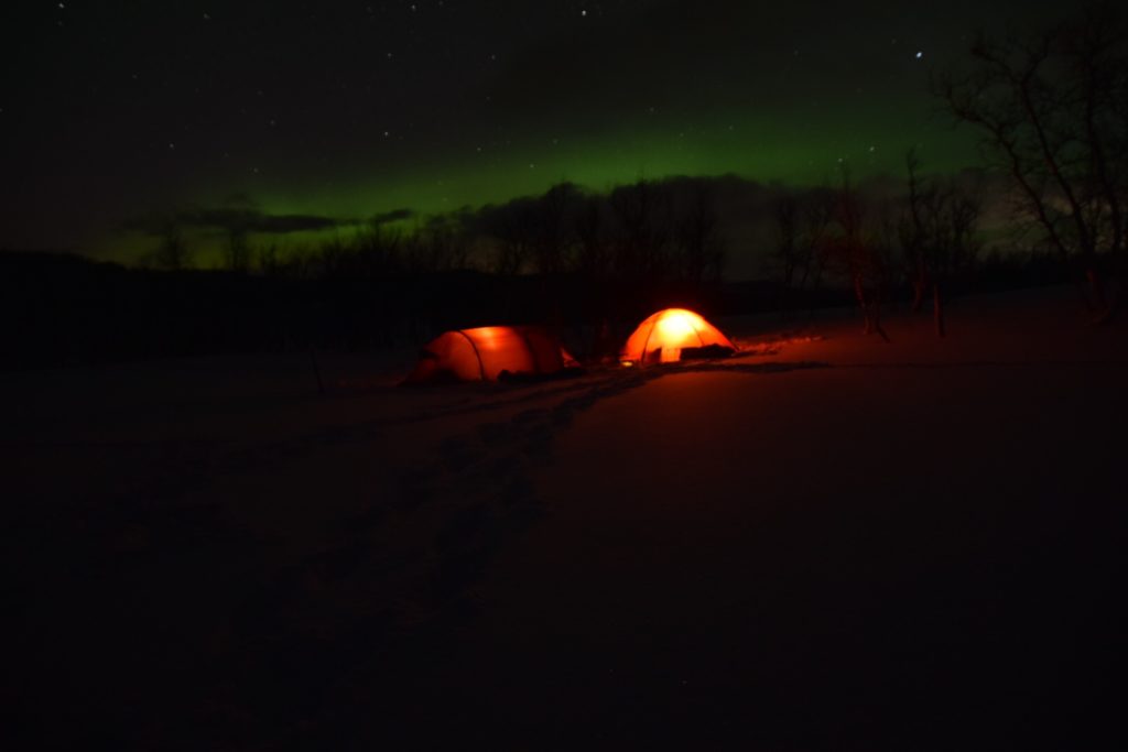 Vi skidade på i det magiska vädret och slog upp våra tält innan stigningen vid Bovallfjället. Kvällen var vacker och bjöd på norrsken över tälten!
