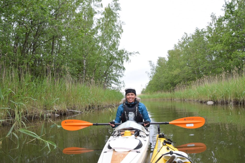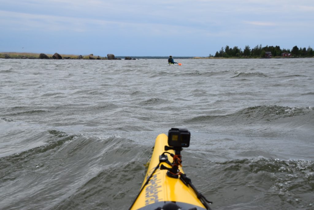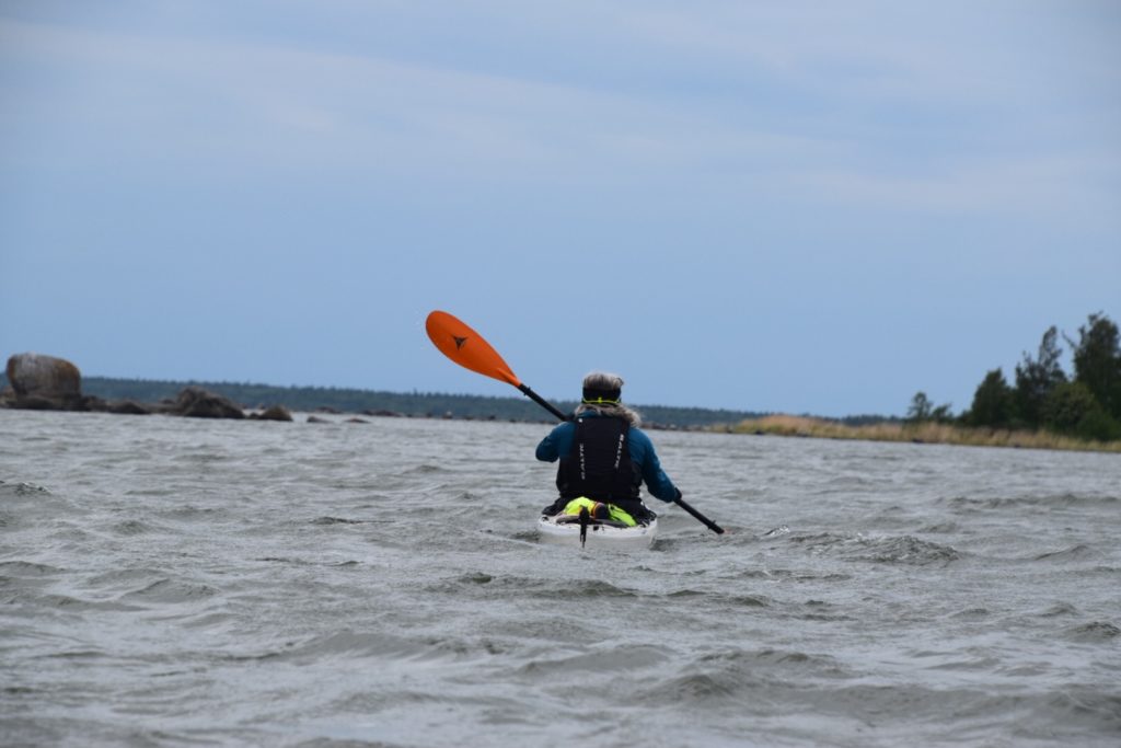 Det blåste 7 m/s ostligt när vi startade och stunderna det blåst mindre än så har varit få idag, mer betydligt fler. Men som skönt var har vi kunnat paddla i lä stora delar av dagen. Först på utsidan av Storskär, Björnskäret och Gloskäret. När vi skulle korsa farleden på väg till Kalvskinnsgrund så fick vi vinden rätt från sidan och flera vågor valde att bryta över oss. Så det var skönt att nå andra sidan. En av dom bästa sakerna med att vara på tur. Att det är så lätt och självklart att känna tacksamhet!