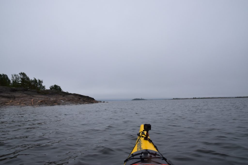 Det regnade precis hela natten. Det kändes därför lite extra skönt att sova inomhus. Eller att sova i tält när det regnar är inga konstigheter. Men att packa ihop blöta prylar är mindre roligt. Nu hade jag allt torrt och jag hade turen att jag hann packa kajaken medan det var uppehåll från regnandet. Jag hann precis lägga i sista prylen och stänga packluckan innan regnet började att falla igen. Skyndade mig ut med kajaken och hoppade i för att inte sitsen skulle hinna bli blöt. Väl i kajaken gör det inget att det regnar.