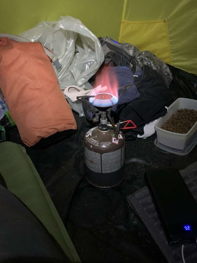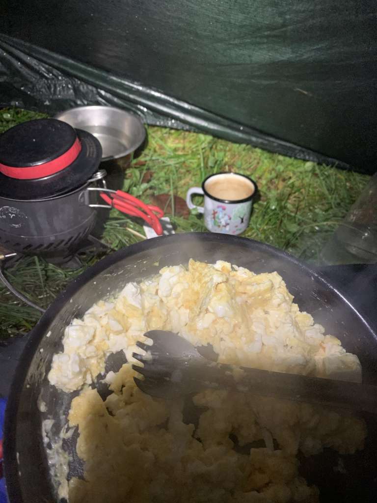 Jag kartgooglade ordet zeltplatz imorse och hittade en plats som enligt söktjänsten skulle vara fri att tälta på. Den låg förvisso nån liten kilometer bortanför leden, men det kändes skönt att veta att det fanns en plats så valde ändå den. Så tältar i natt längs en ödslig väg. Tältet var rätt så blött som jag packade ihop det blött i morse så eldade med gasköket inne i det innan jag tog fram sovsäckarna. Efter en kort stunds eldande blev det torrt. Känns alltid skönt att ha ett torrt tält! Varmt och gott var det att sitta i värmen från gasen dessutom. Sen lagade jag en omelett till middag (ikväll igen). Är härligt trött i kroppen efter dagens alla backar så nu ska det bli skönt att sova!