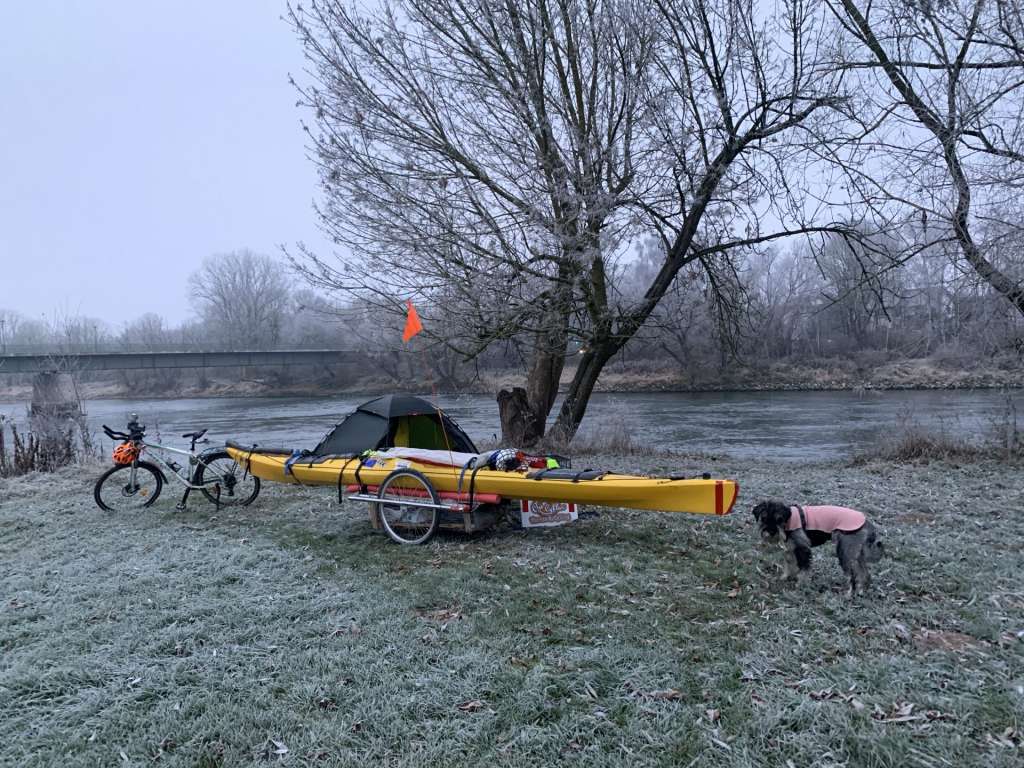 Tanken var att vi skulle tälta vid kajakklubben i Regensburg i natt. Men där finns inga faciliteter igång så här års, så när jag kom dit och klockan inte hunnit bli så mycket kände jag att vi lika gärna kunde fortsätta som kroppen kändes rätt så pigg. Hittade en enskild plats intill Donau. Som det var rätt så rått och kallt (har varit det större delen av dagen), så tyckte vi alla tre att det var skönt att krypa in i tältet. Hundarna blev snabbt bekväma och somnade gott. Jag hade supersvårt att somna. Jag var för kall. Så efter en stund så satte jag mig upp i sovsäcken istället, kokade upp vatten som jag hällde i en flaska och stoppade i sovsäcken. Snart hade jag lagom temperatur för att somna!