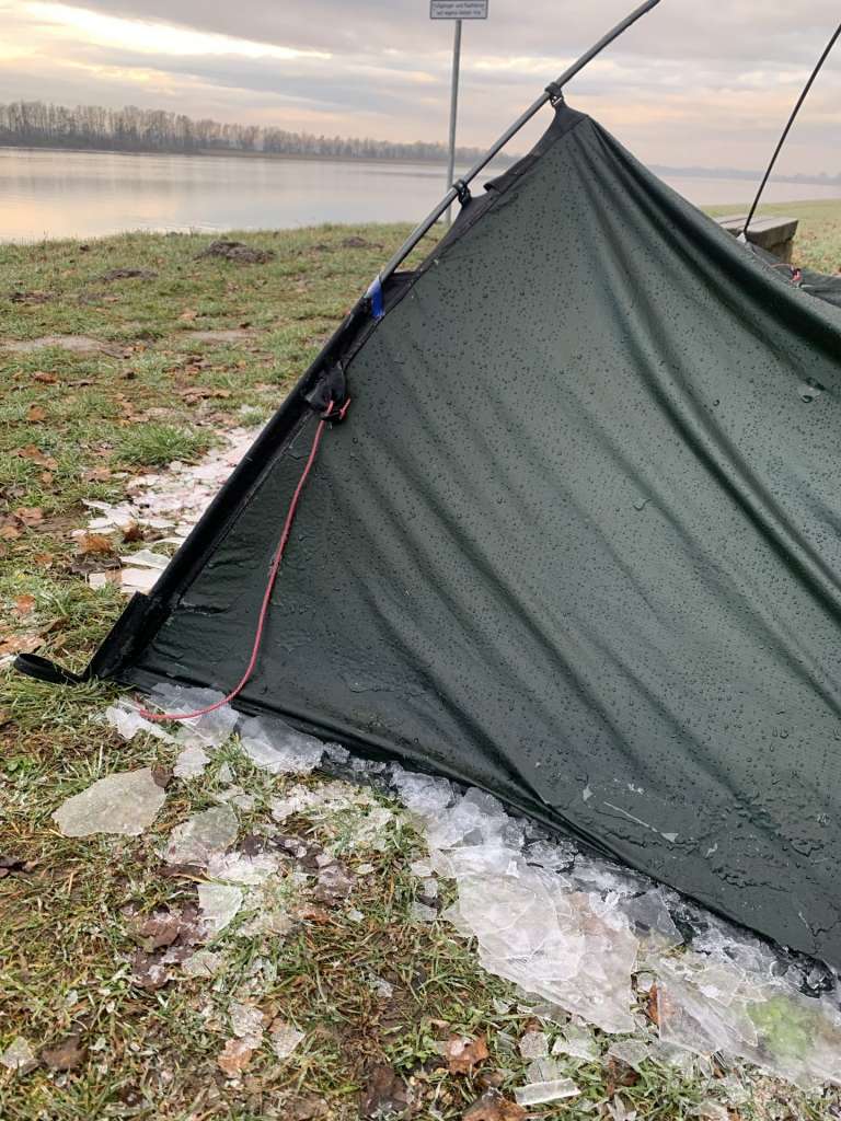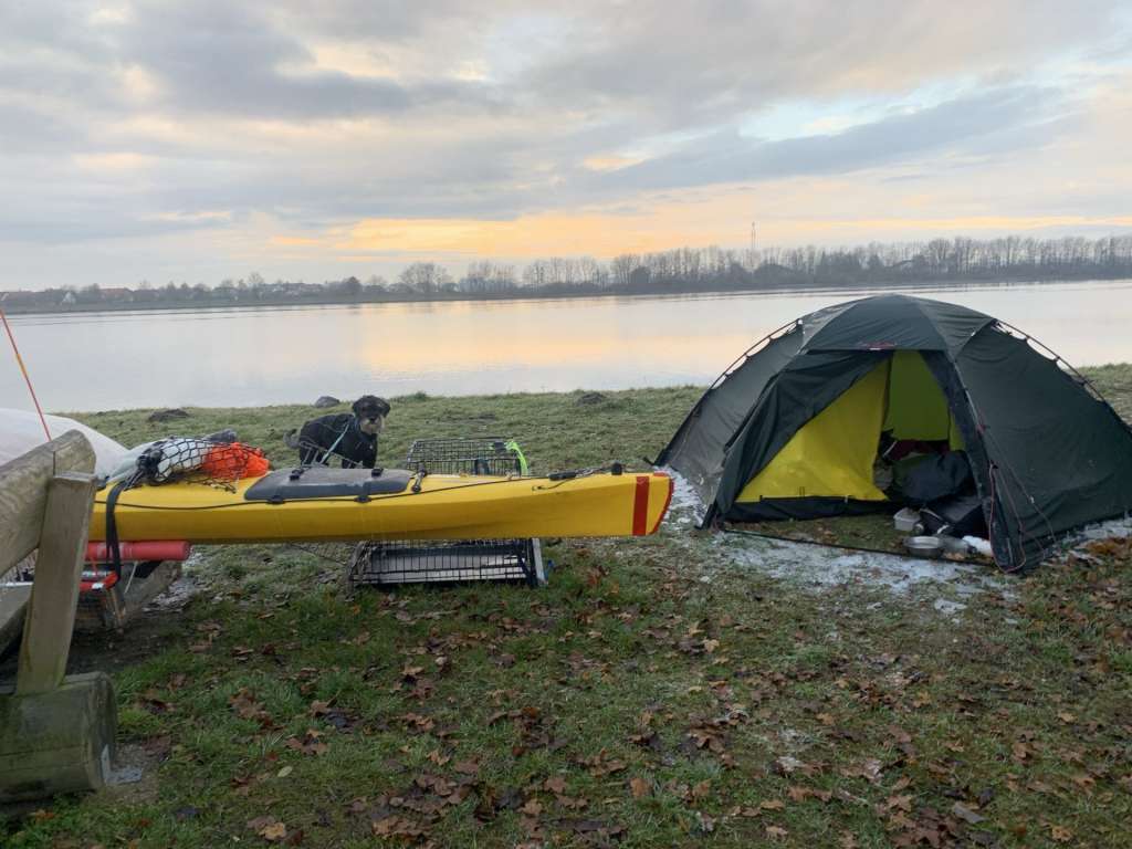 Kombinationen ösregn i natt och flera minusgrader förvandlade tältet till en igloo. Ett tjockt lager is lade sig som en hinna över hela tältet som sedan rasade ner och lade sig som en grans runt det när jag öppnade tältduken. Jag sköt lite på dagens start då det fortfarande duggregnade på morgonen. Sen tog det lite tid att komma iväg då jag var tvungen att lasta om kajaken då ”korvarna” som den vilar på hade hamnat fel.