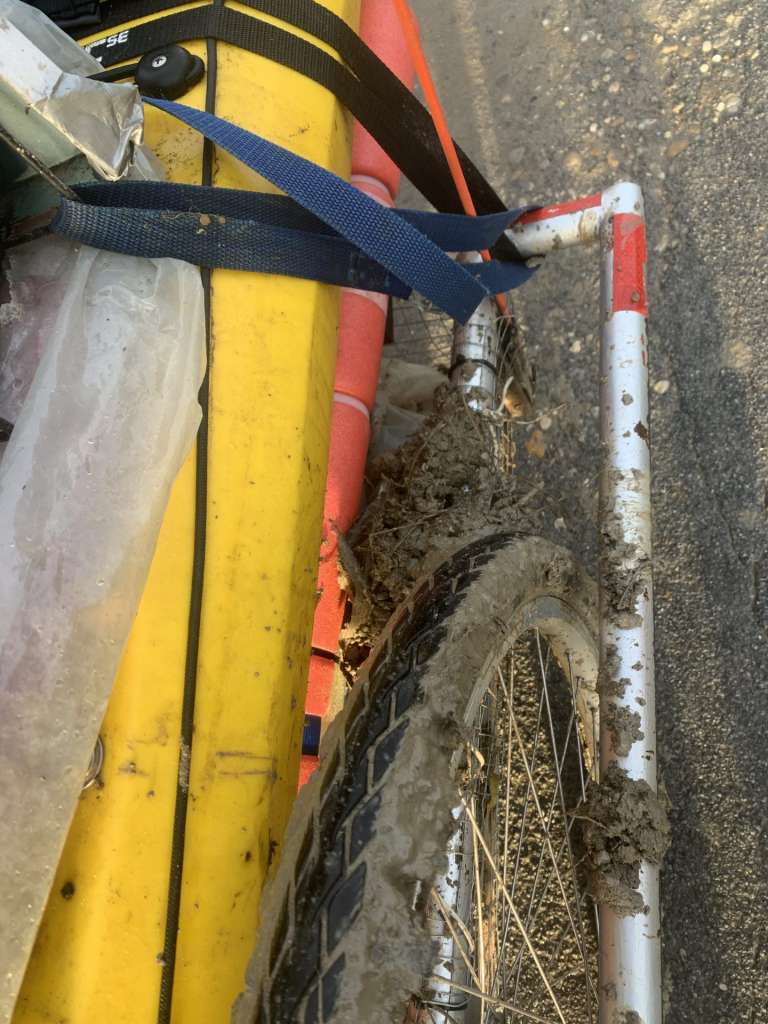 Det började med härlig cykling i några kilometer. Sen hamnade vi på en grusväg som efter ett tag förvandlades till nån form av kvicksand. Helt fruktansvärt. Hjulen sjönk ner i leran och ett flera centimeter tjockt lager med lera byggdes på alla hjulen och snart tog jag mig inte framåt. Att leda cykeln var minst lika svårt. Som tur var var det bara så illa i några hundra meter innan vi kunde ta oss av den vägen och ut på en asfalterad väg. Att få rent allt sen var ett projekt för sig..