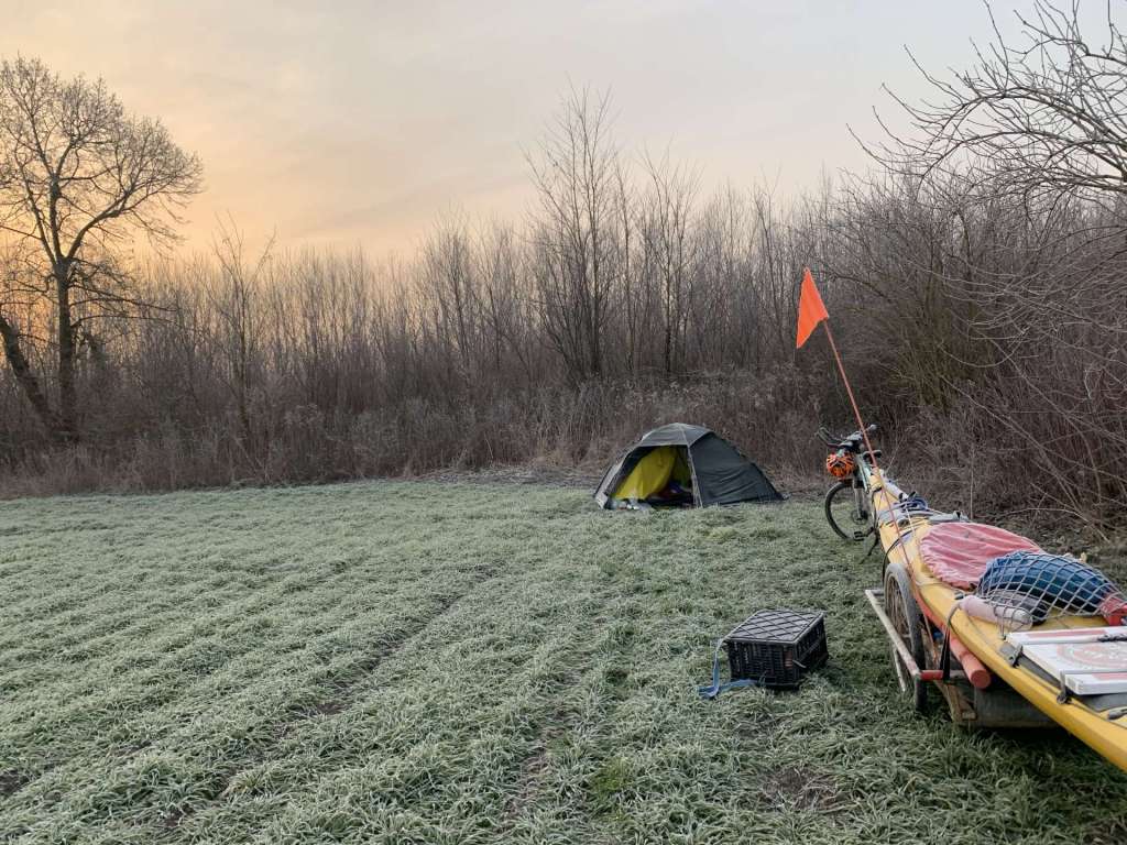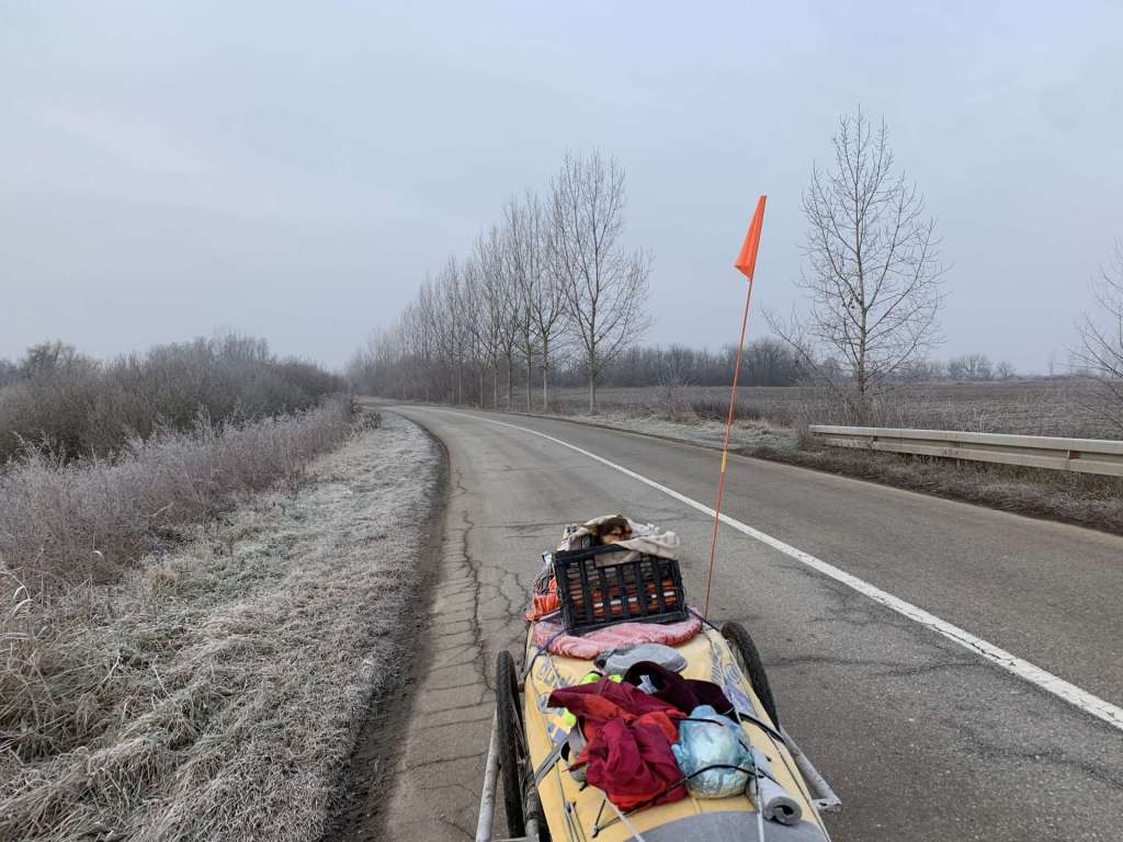 Även denna natt var kall men otroligt vacker. Vakna pga kylan ett par gånger och kokade då om vattnet i mina flaskor. Himlen var helt stjärnklar och inte åt något håll fanns ”naturliga” ljuskällor. Det var ännu minusgrader när jag hoppade på cykeln, men timme för timme steg temperaturen med flera grader och som varmaste hade jag 7 grader varmt idag. Dagen var disig och molnig. Men det var verkligen skönt med värmen. Helt vindstilla.