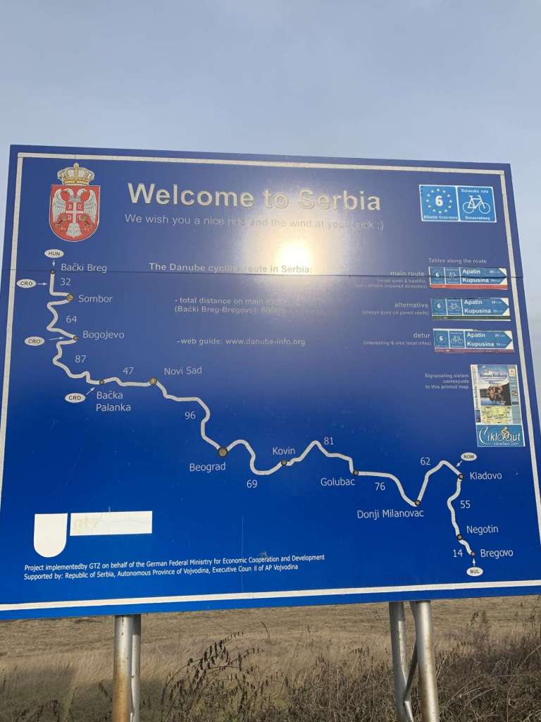 Även Serbien finns det skyltar som markerar ut Eurovelo-leden. Men dom sitter inte lika tätt som i tidigare länder. En annan skillnad är att skyltarna här har ett litet visdomsord längst ner. Alla skyltar har olika.